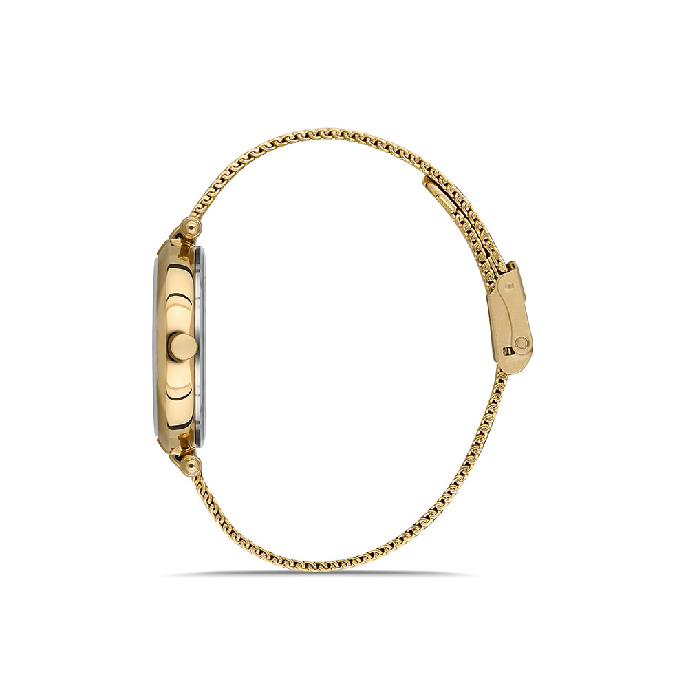 Cadran si carcasa decorate cu zirconii albe; bratara tip mesh, cu inchizatoare reglabila.