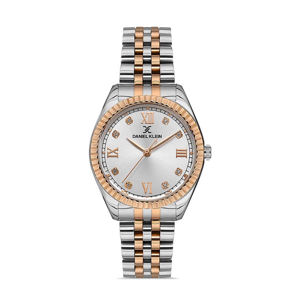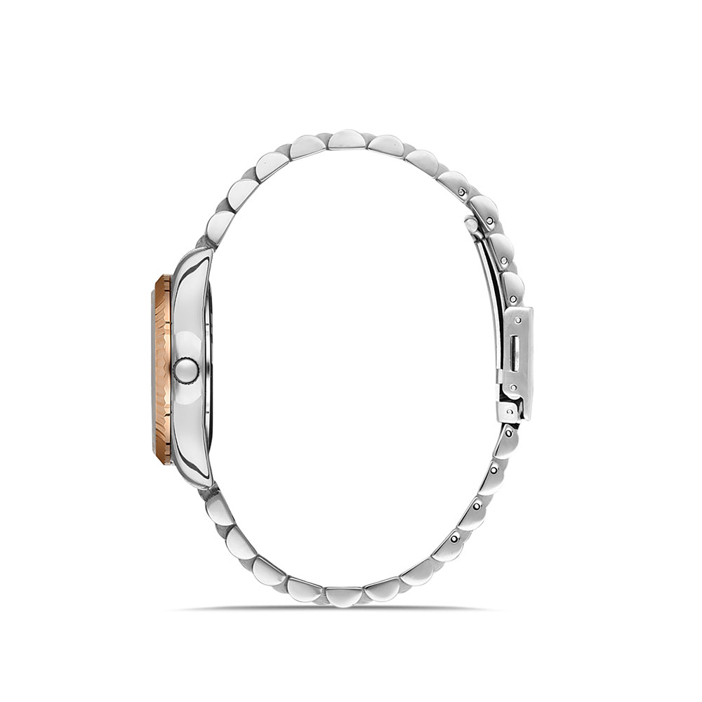 Cadran decorat cu zirconii albe; carcasa argintie, cu bezel decorativ auriu rose; bratara tip zale, in doua culori, argintiu si auriu rose, cu inchizatoare tip fluture.
