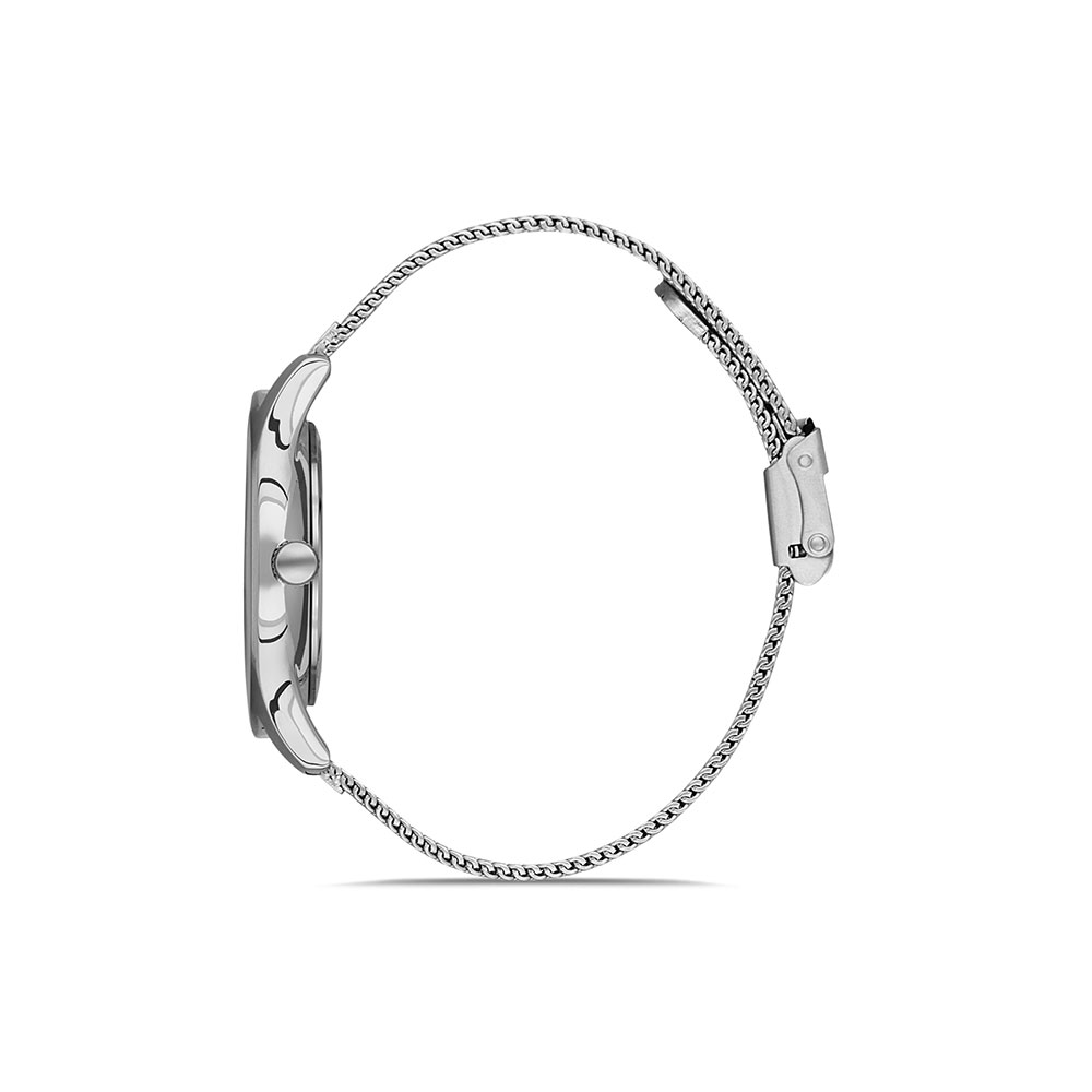 Cadran decorat cu zirconii albe; bratara tip mesh, cu inchizatoare reglabila.