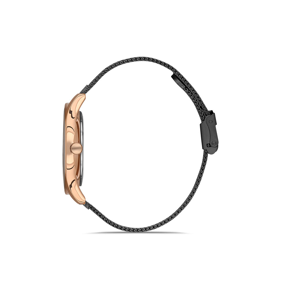 Cadran decorat cu zirconii albe; bratara tip mesh, cu inchizatoare reglabila.