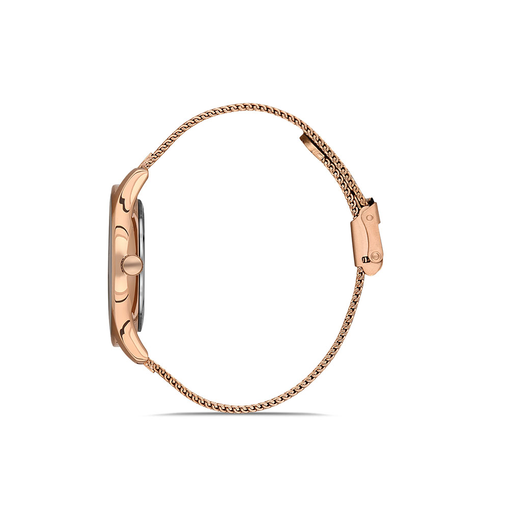 Bratara din aliaj metalic auriu rose este conceputa intr-un stil mesh fin, asigurand un confort sporit si o potrivire perfecta datorita sistemului de inchidere reglabil. Mecanismul quartz japonez garanteaza precizie si fiabilitate, iar rezistenta la apa de 3 ATM il face potrivit pentru utilizarea zilnica, protejandu-l impotriva stropilor accidentali.