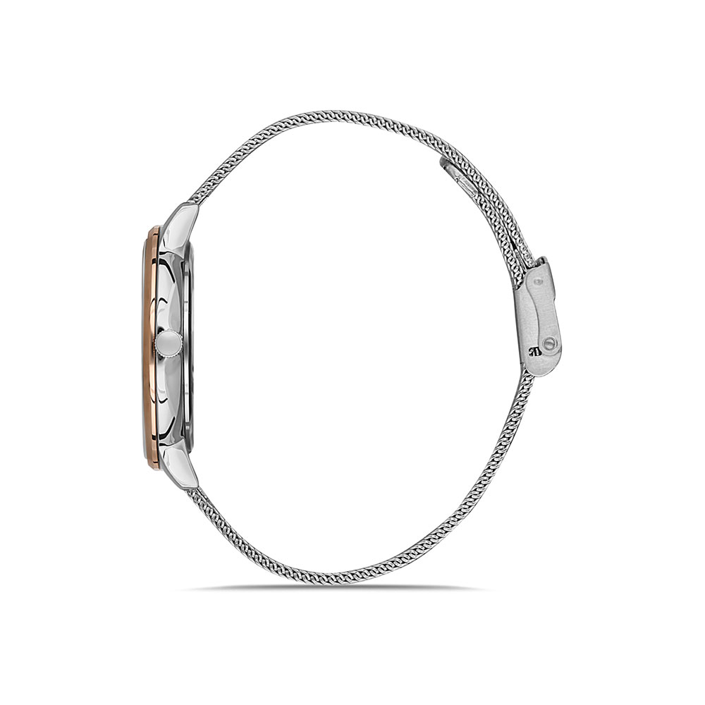 Cadran decorat cu zirconii albe; bratara tip mesh, cu inchizatoare reglabila.