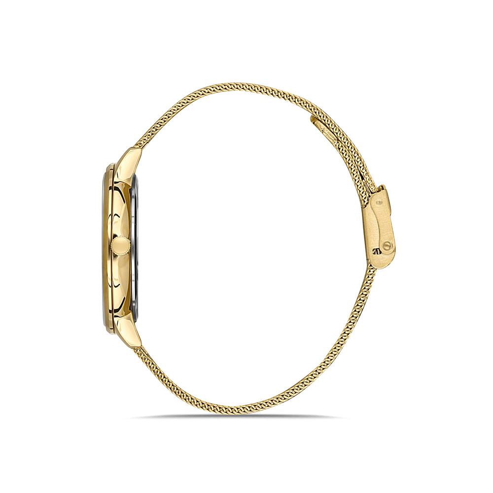 Cadran decorat cu zirconii albe; bratara tip mesh, cu inchizatoare reglabila.