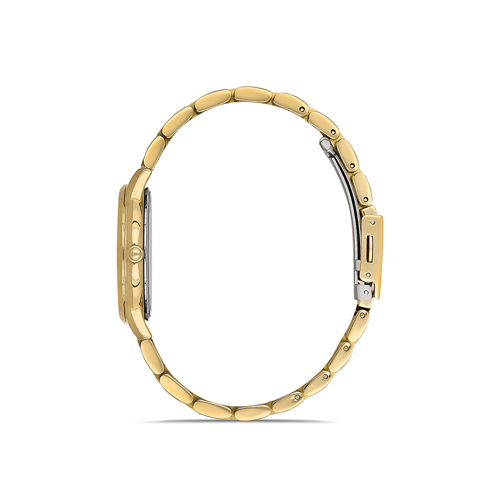 Cadran decorat cu zirconii albe; bratara tip zale, cu inchizatoare tip fluture.
