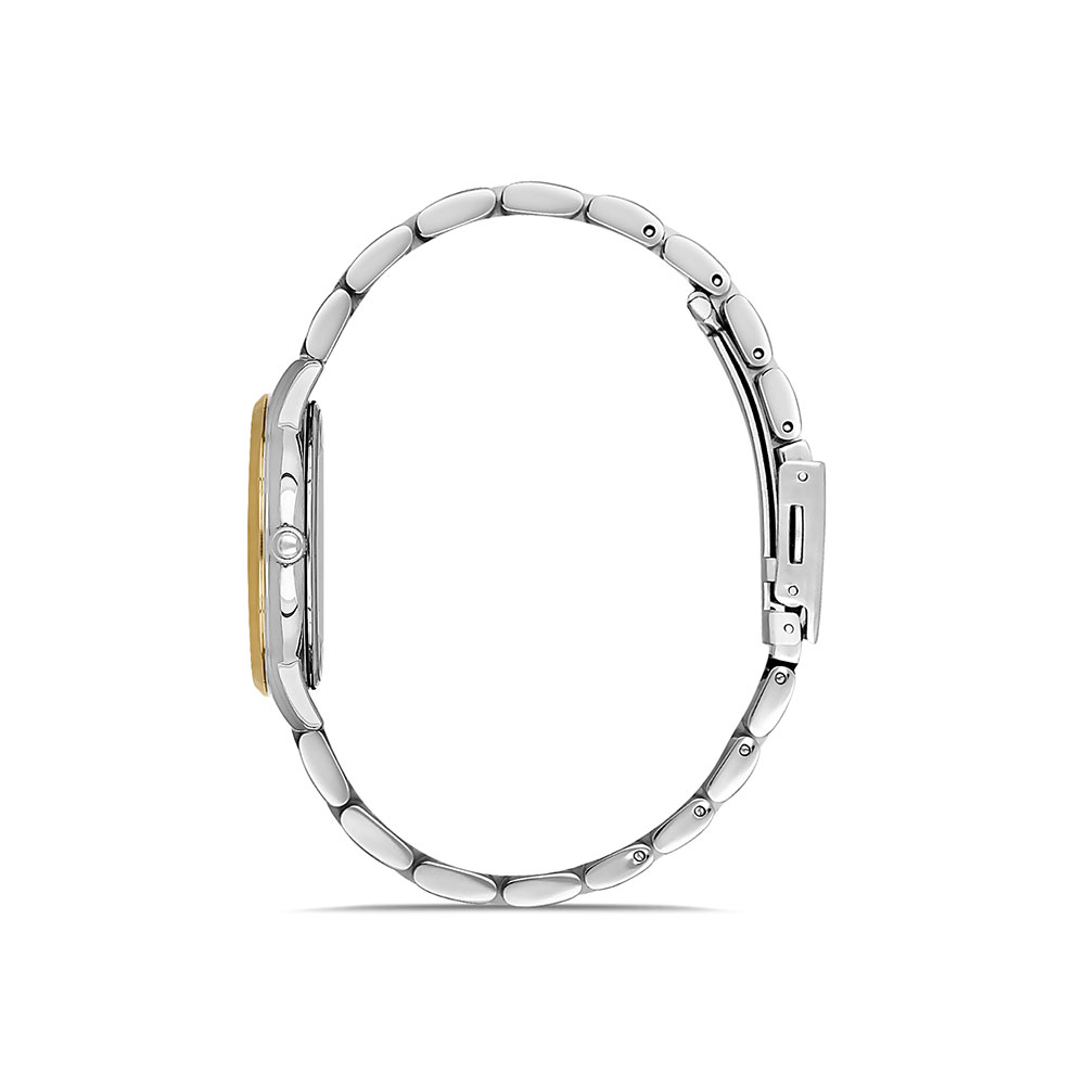 Cadran decorat cu zirconii albe; carcasa argintie, cu bezel decorativ auriu; bratara tip zale, in doua culori, argintiu si auriu, cu inchizatoare tip fluture.