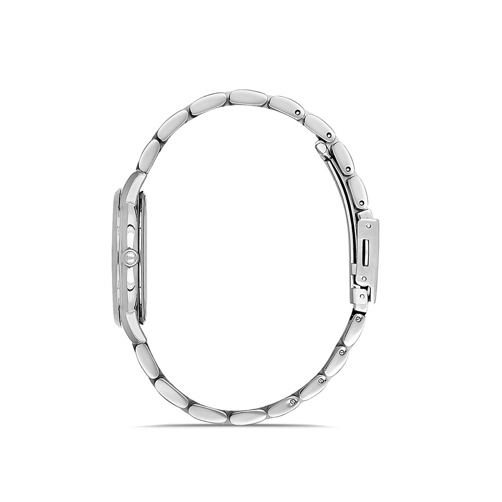 Cadran decorat cu zirconii albe; bratara tip zale, cu inchizatoare tip fluture.