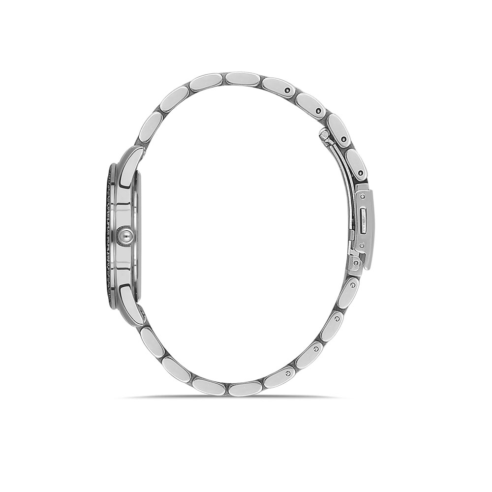 Carcasa decorata cu zirconii albe; bratara tip zale, cu inchizatoare tip fluture.