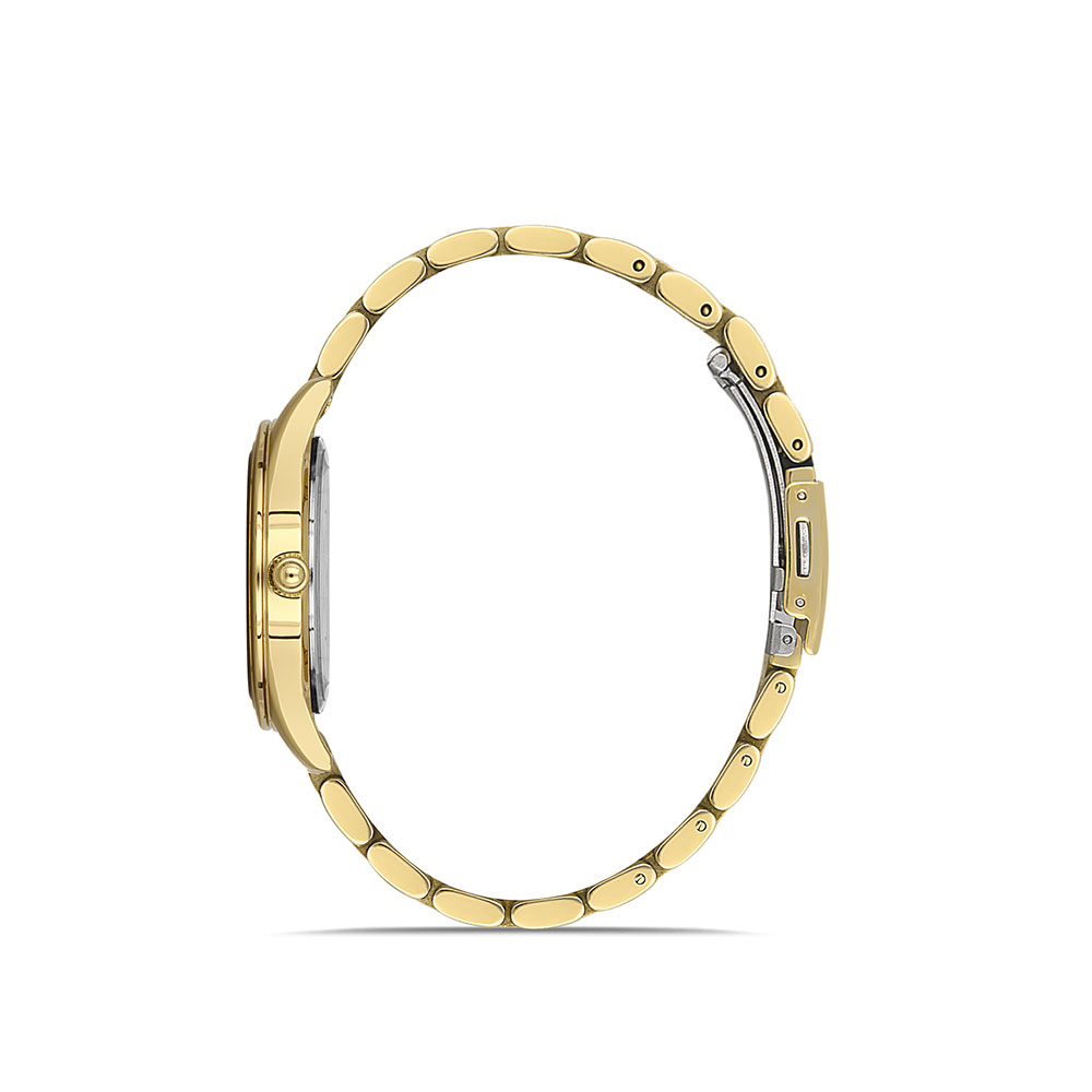 Cadran decorat cu zirconii albe; indicatoare luminoase; bratara tip zale, cu inchizatoare tip fluture.