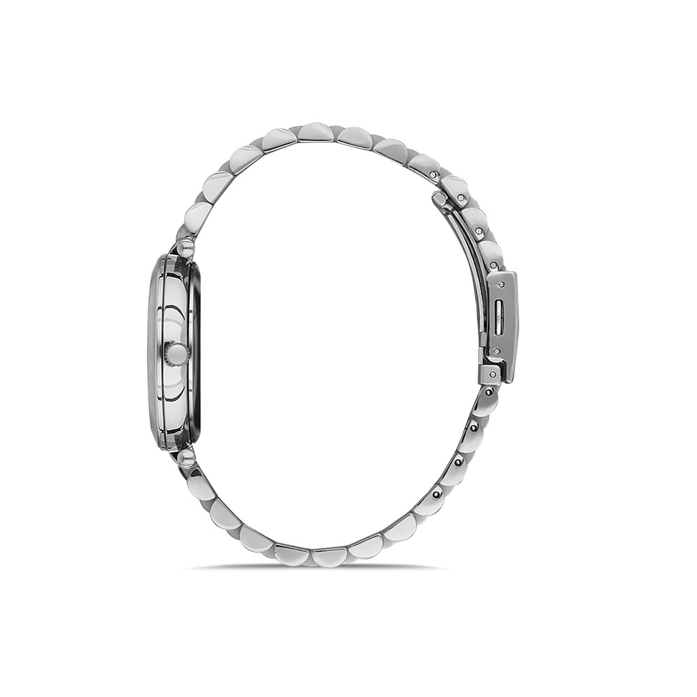Bratara ceasului este formata din zale mici in 5 randuri, fiind realizata dintr-un aliaj de metal cu finisaj argintiu, care ii confera un aspect stralucitor si sofisticat. Bratara este ajustabila, astfel incat se poate adapta cu usurinta la orice dimensiune a incheieturii mainii.