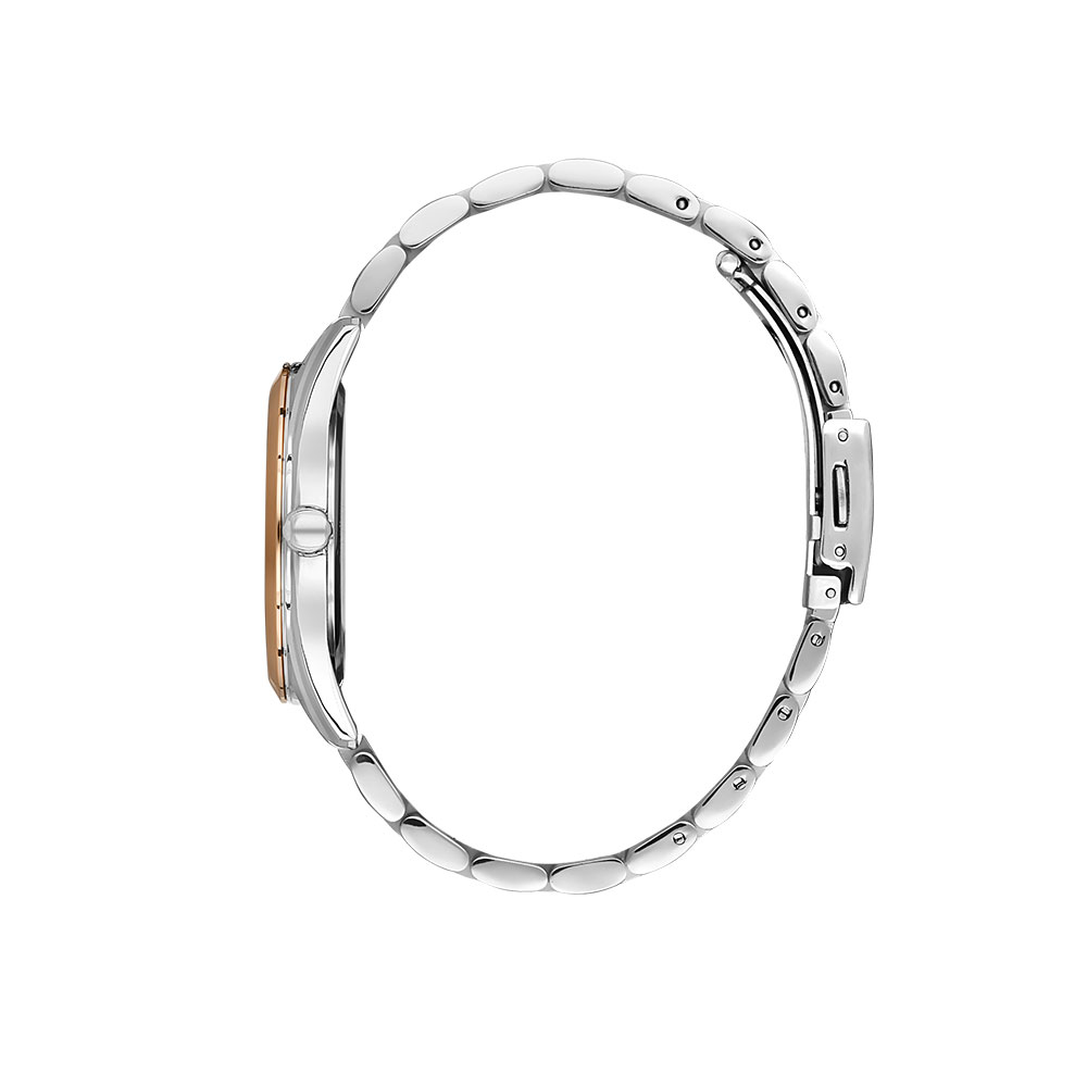 Bratara din otel inoxidabil imbina tonurile de argintiu si auriu rose, asigurand un aspect sofisticat si o durabilitate excelenta. Sistemul de inchidere fluture ofera siguranta si confort pe incheietura.