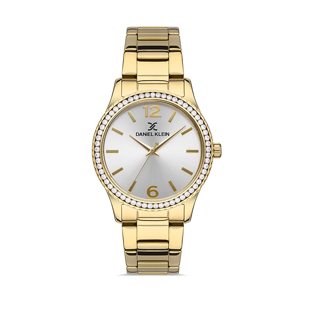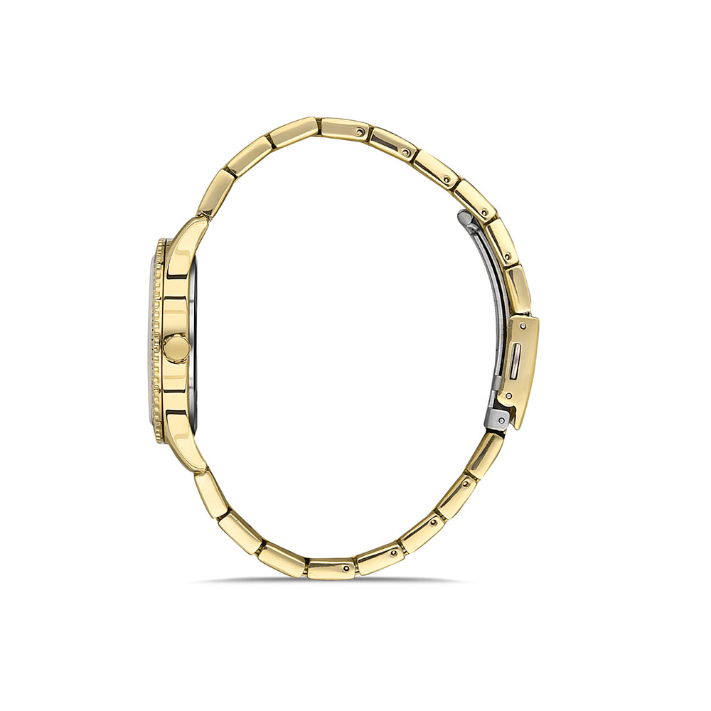 Cadranul inconjurat de zirconii mici adauga stralucire tinutelor tale, iar culoarea aurie adauga un strop de eleganta.