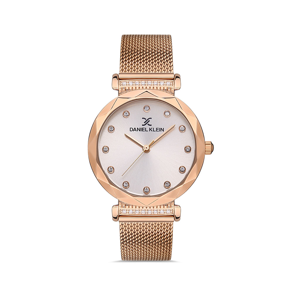 Ceasul de dama auriu rose, cu carcasa fatetata si zirconii in locul cifrelor te va face sa stralucesti.