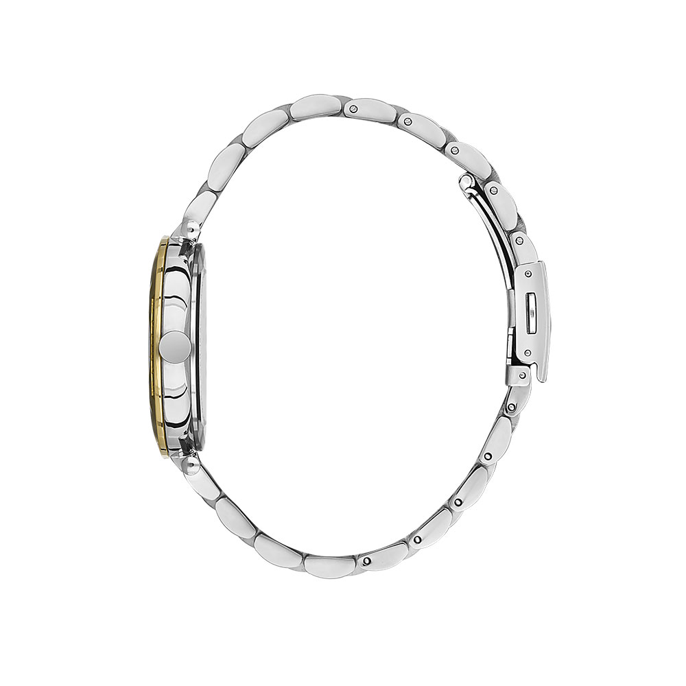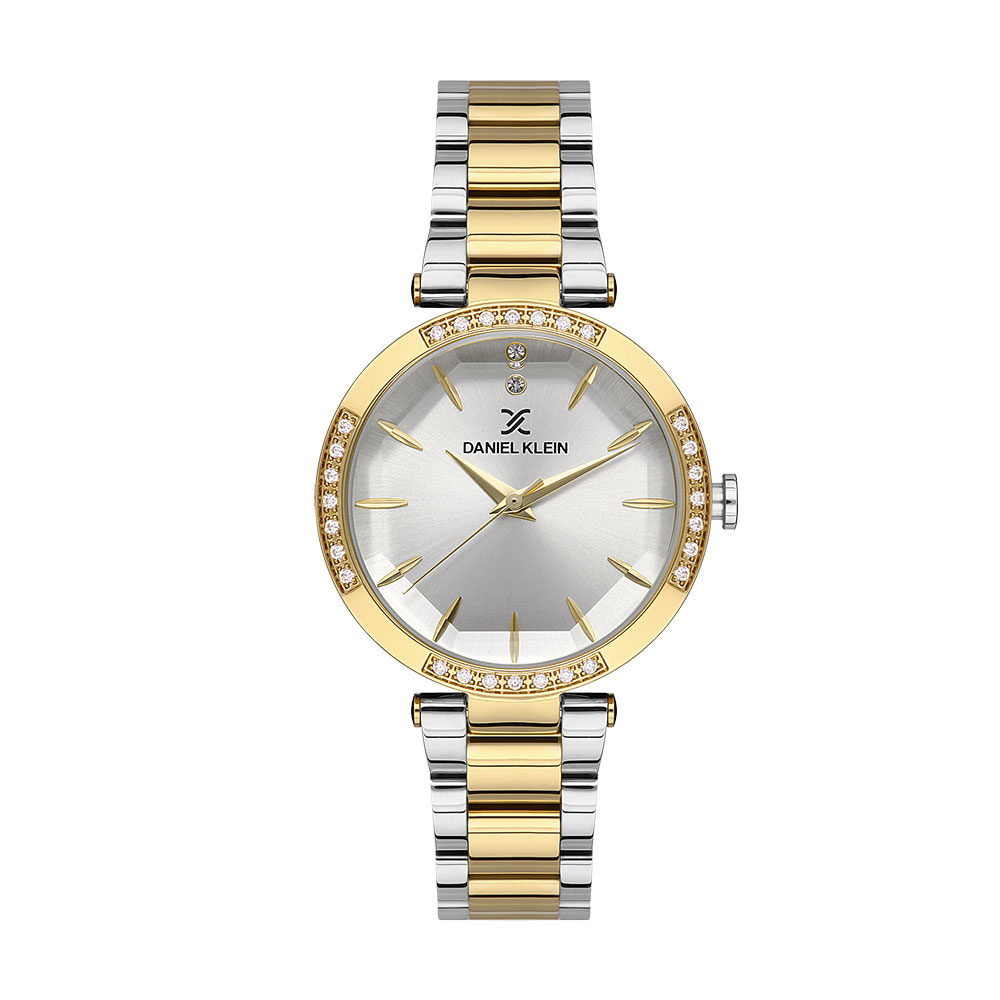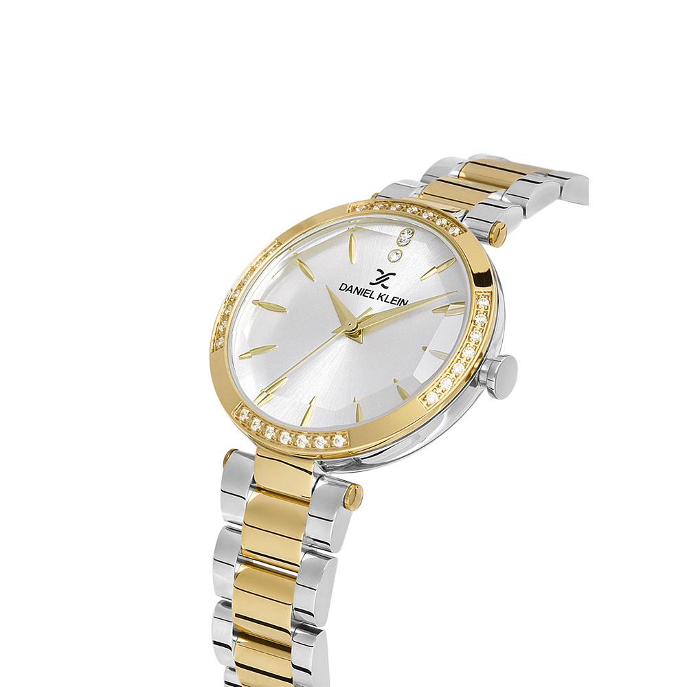 Ceasul Daniel Klein DK.1.13435.3 pentru femei cu o bratara in doua tonuri: auriu si argintiu, are un design elegant, cu un cadran argintiu ce evidentiaza elementele de design stralucitoare ale acestuia. Cadranul este decorat cu cristale fine dreptul orei 12 cat si pe carcarasa, oferind un plus de stralucire si femininitate. Invelisul auriu cu finisaj de calitate adauga o nota de lux si sofisticare. Acest ceas combina eleganta si functionalitatea, fiind potrivit pentru orice ocazie.