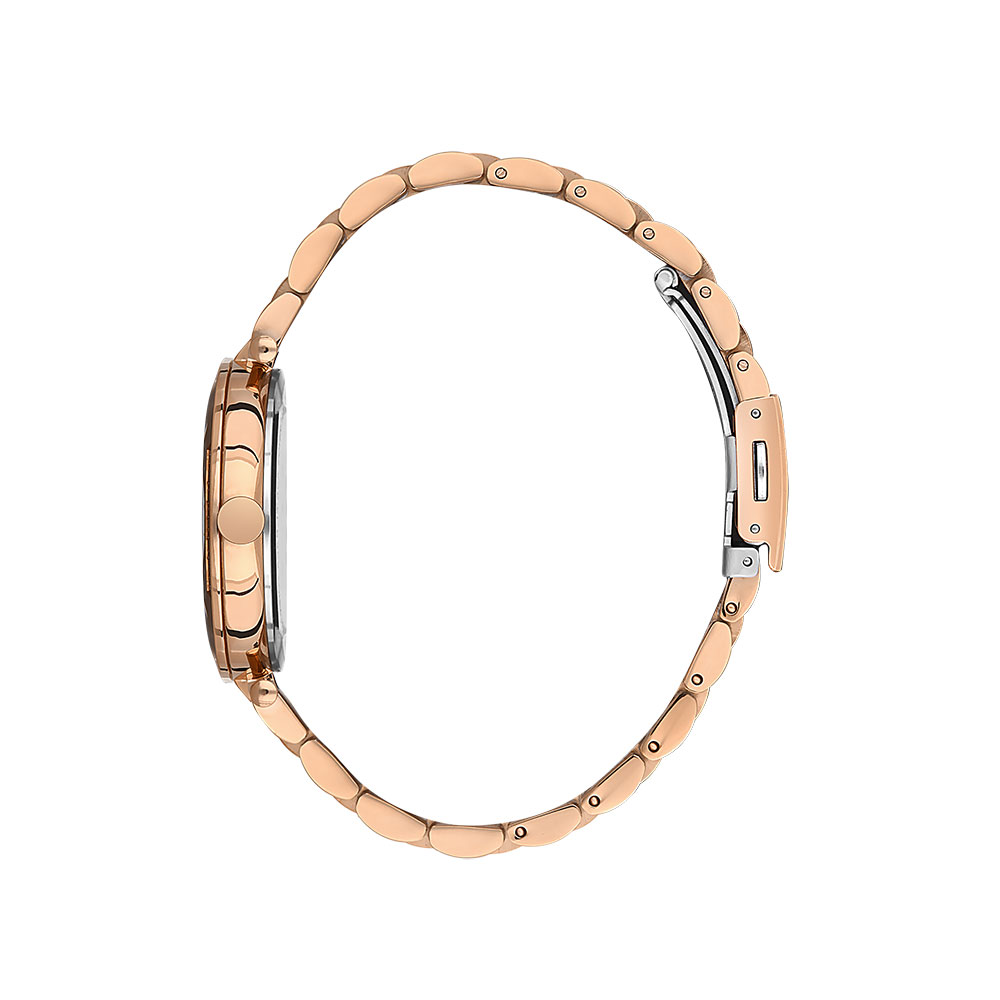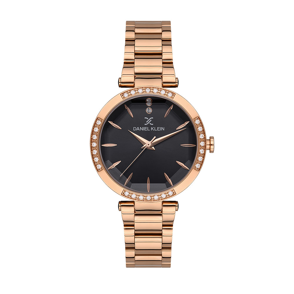 Ceasul Daniel Klein DK.1.13435.5 pentru femei auriu rose are un design elegant, cu un cadran negru ce evidentiaza elementele de design stralucitoare ale acestuia. Cadranul este decorat cu cristale fine dreptul orei 12 cat si pe carcarasa, oferind un plus de stralucire si femininitate. Invelisul din auriu rose cu finisaj de calitate adauga o nota de lux si sofisticare. Acest ceas combina eleganta si functionalitatea, fiind potrivit pentru orice ocazie.