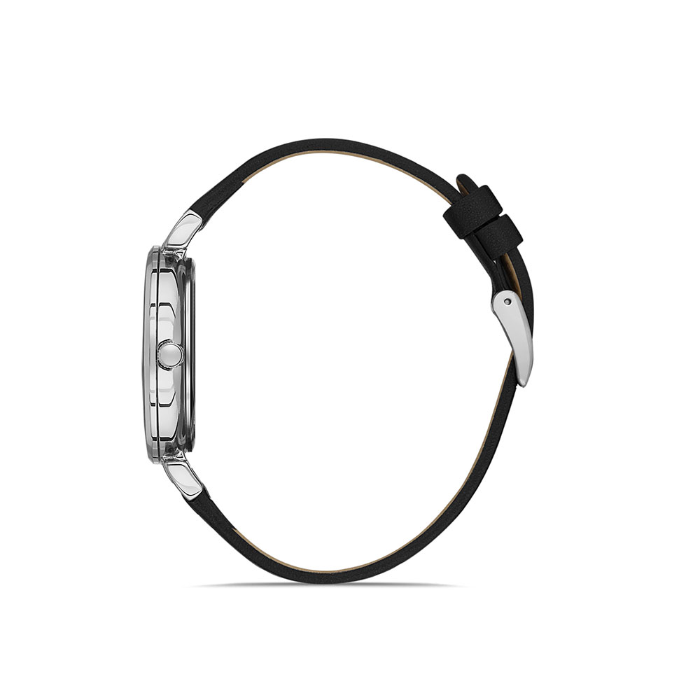Cureaua este din piele de culoare neagra, iar carcasa argintie este din otel inoxidabil.