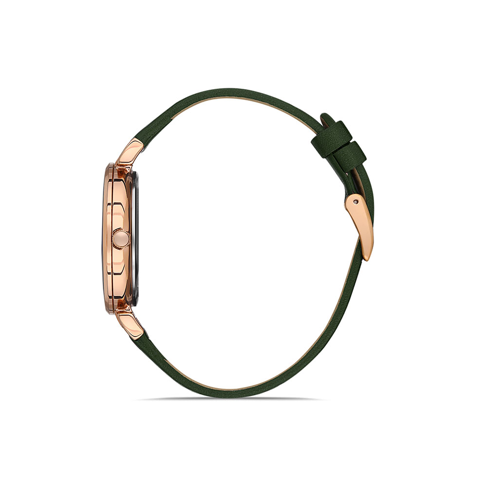 Ceas de dama cu curea din piele de culoare verde si carcasa auriu rose cu zirconii stralucitoare.