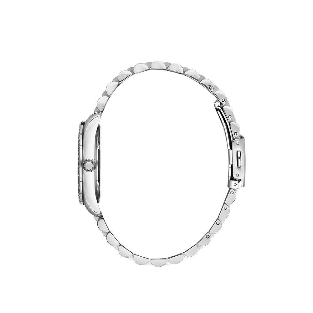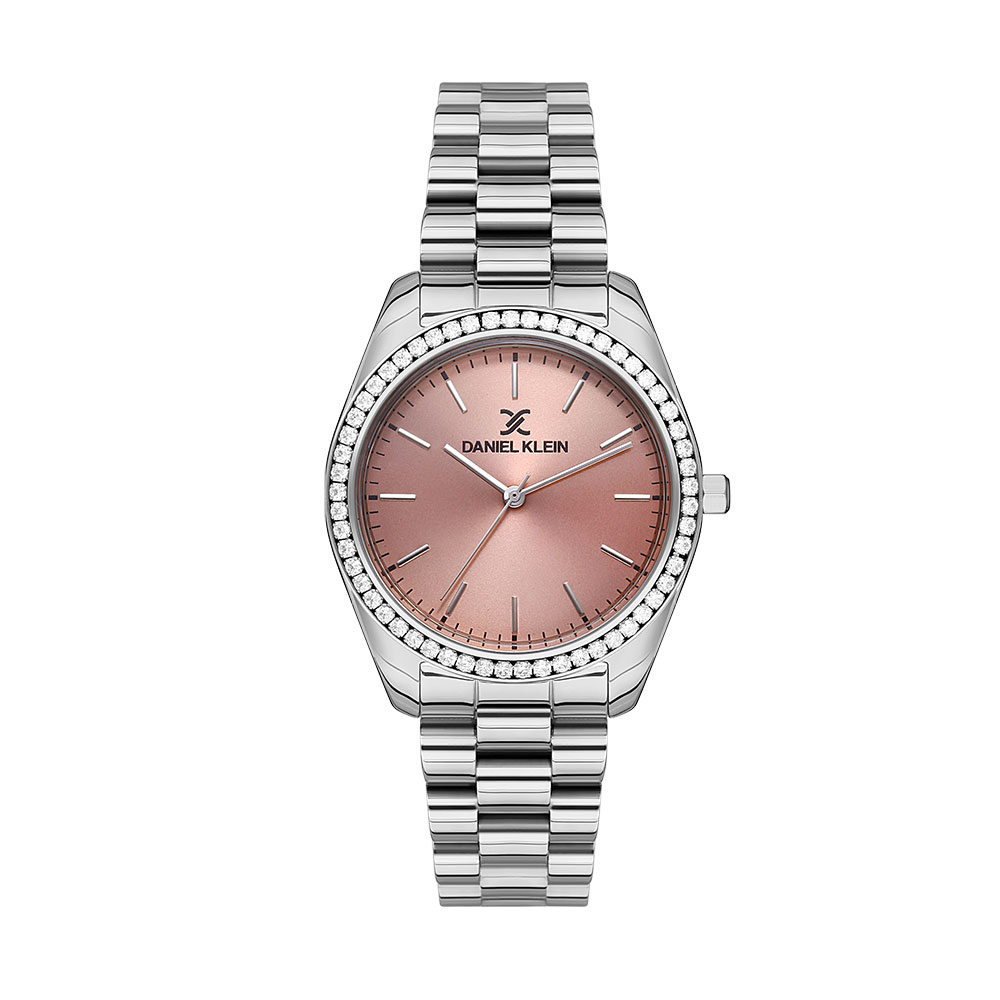 Ceas de dama Daniel Klein DK.1.13445.2 argintiu cu bratara din otel inoxidabil si zale. Ceasul de dama are o nota eleganta datorita cristalelor din jurul cadranului, dar se potriveste perfect si purtarilor zilnice la birou. Cadranul de culoare roz, adauga o pata de culoare tinutei tale. Indicatoare de tip linii pentru o citire usoara a orei.