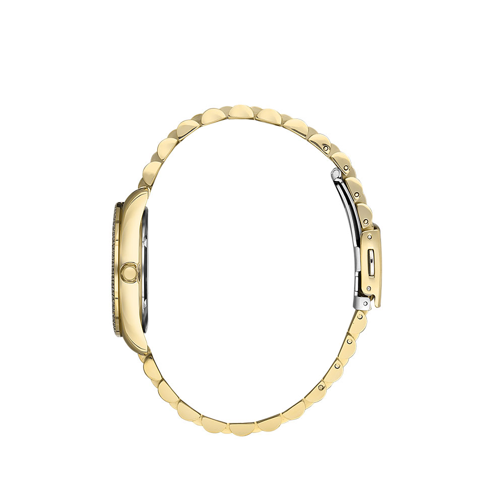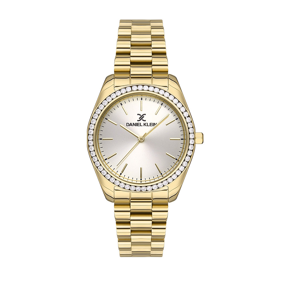Ceas de dama Daniel Klein DK.1.13445.3 auriu cu bratara din otel inoxidabil si zale. Ceasul de dama are o nota eleganta datorita cristalelor din jurul cadranului, dar se potriveste perfect si purtarilor zilnice la birou. Cadranul auriu, adauga o pata de culoare tinutei tale. Indicatoare de tip linii pentru o citire usoara a orei.