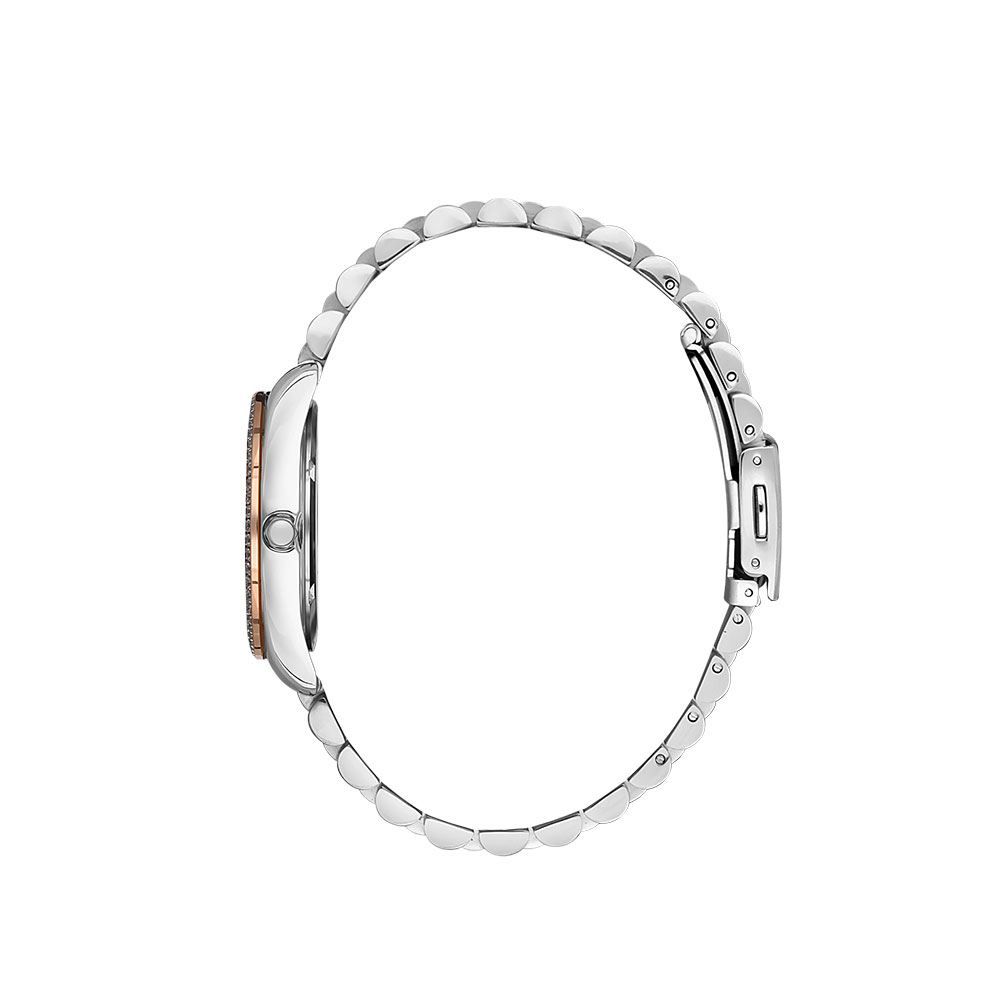 Bratara bicolora, in nuante de argintiu si auriu rose, confectionata din otel inoxidabil, completeaza perfect designul elegant al ceasului. Sistemul de inchidere tip fluture asigura confort si siguranta la purtare, fiind usor de ajustat pentru o potrivire perfecta.