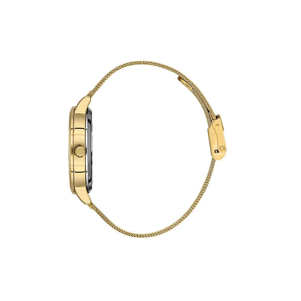 Bratara din otel inoxidabil auriu, cu un sistem de inchidere reglabil, asigura confort si siguranta la purtare, adaptandu-se perfect incheieturii tale. Mecanismul quartz japonez Epson Y121f1 garanteaza o precizie ridicata, cu o abatere de doar ±20 secunde pe luna.