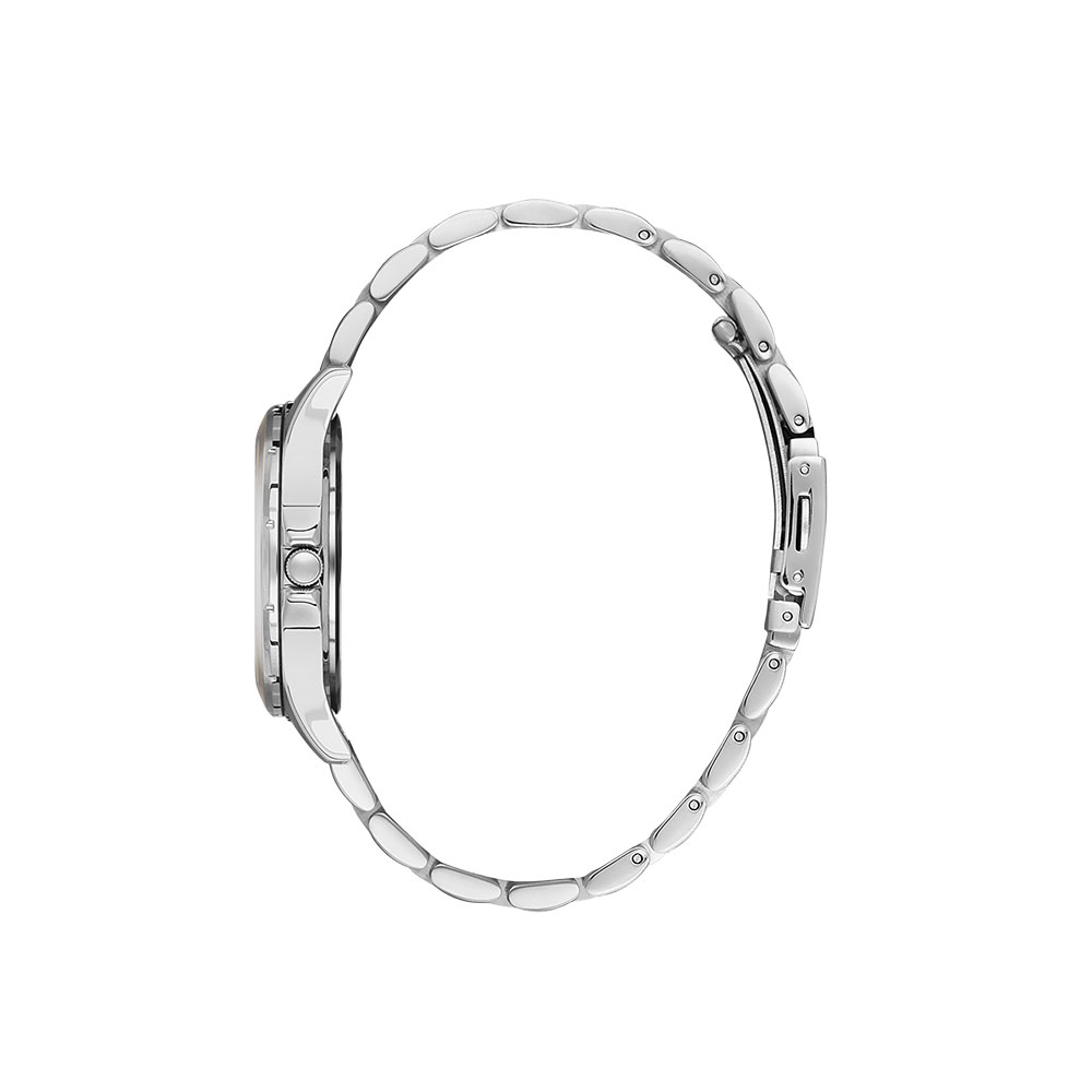 Ceasul se remarca printr-o bratara bicolora din otel inoxidabil, cu accente argintii si rose gold, ce adauga un aer distinctiv si feminin. Cadranul argintiu, decorat cu marcaje minimaliste si indicatori in ton auriu roz, completeaza perfect acest design elegant.