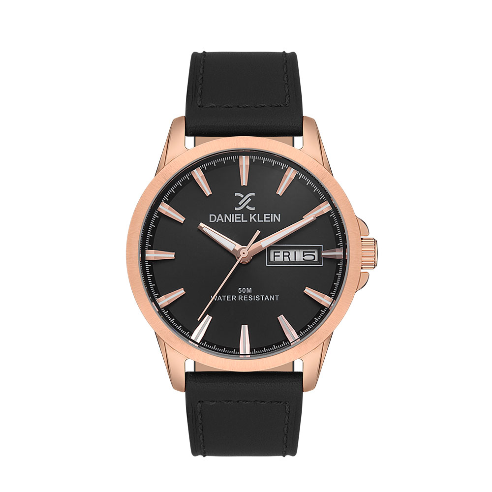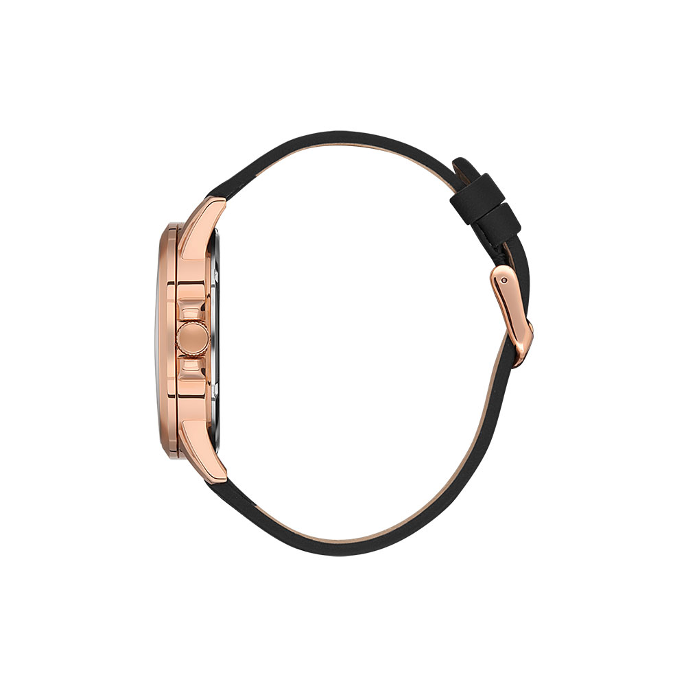 Cadranul negru cu afisaj analogic este pus in valoare de marcajele si limbile in nuanta auriu rose, oferind un contrast elegant si o vizibilitate excelenta. Carcasa rotunda, realizata din aliaj metalic, are un diametru de 44 mm si o grosime de 12 mm, asigurand o prezenta puternica la incheietura mainii.