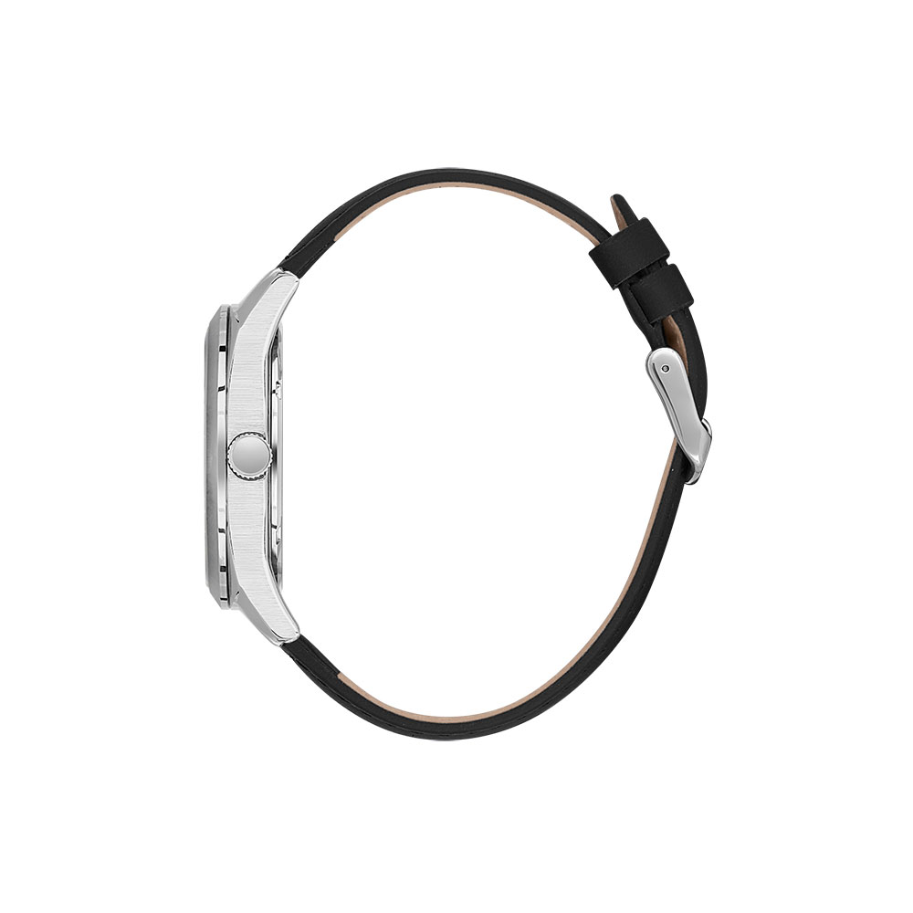 - Cadran negru cu afisaj analogic – un design clasic, usor de citit, cu indicatori argintii contrastanti.