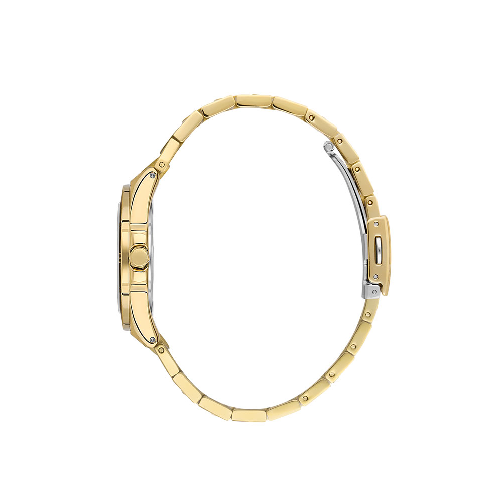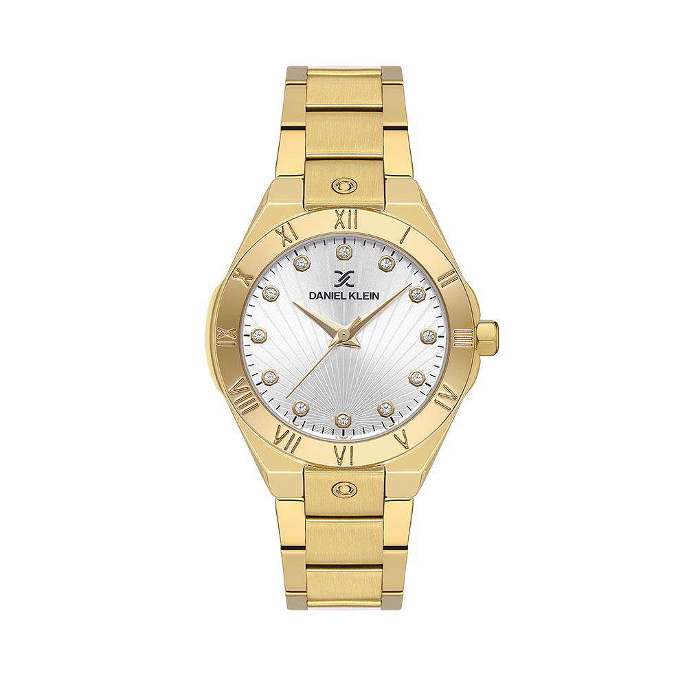 Cadranul argintiu cu efect raze de soare este decorat cu cristale stralucitoare pe marcajele orelor, oferindu-i un aspect luxuriant. Luneta este gravata cu cifre romane pentru un plus de stil clasic, iar carcasa aurie din aliaj metalic adauga un aer sofisticat.