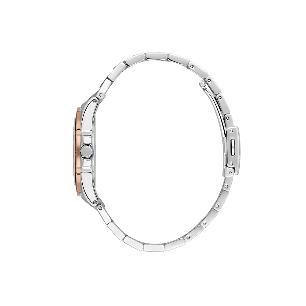 Bratara bicolora, realizata din otel inoxidabil, imbina nuantele de argintiu si auriu rose, oferind un aspect modern si versatil. Sistemul de inchidere tip fluture asigura confort si siguranta pe incheietura.