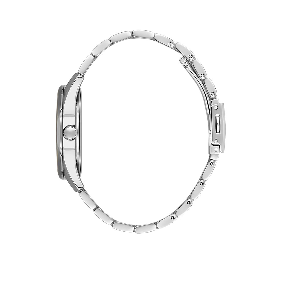 Carcasa rotunda din aliaj metalic argintiu cu un diametru de 36 mm ofera un aspect rafinat, in timp ce cadranul negru adauga un contrast elegant, usor de asortat cu orice tinuta. Bratara din otel inoxidabil argintiu asigura confort si durabilitate, fiind echipata cu un sistem de inchidere tip fluture pentru o fixare sigura pe incheietura.