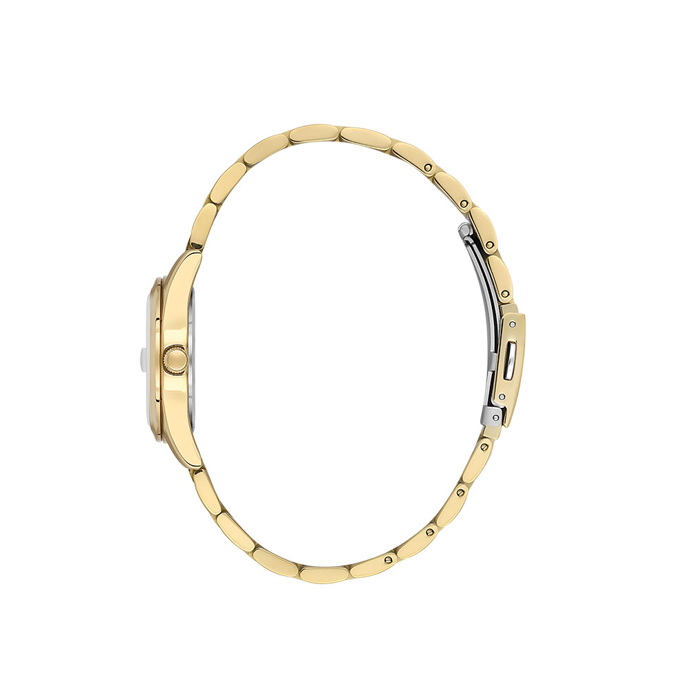 Cu un mecanism japonez Epson Vx12e11, acest ceas ofera precizie de neegalat, avand o abatere de doar ± 20 secunde pe luna. Afisajul analogic negru este accentuat de o carcasa rotunda, aurie, din aliaj metalic, care se potriveste perfect cu bratara eleganta. Geamul din cristal mineral adauga un strat de protectie si claritate, in timp ce rezistenta la apa de 3 atm asigura durabilitate in conditii de umiditate.