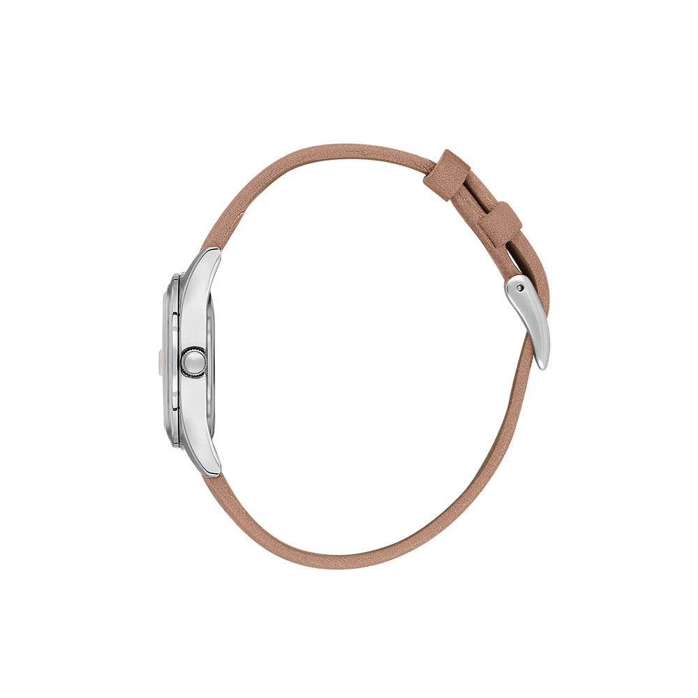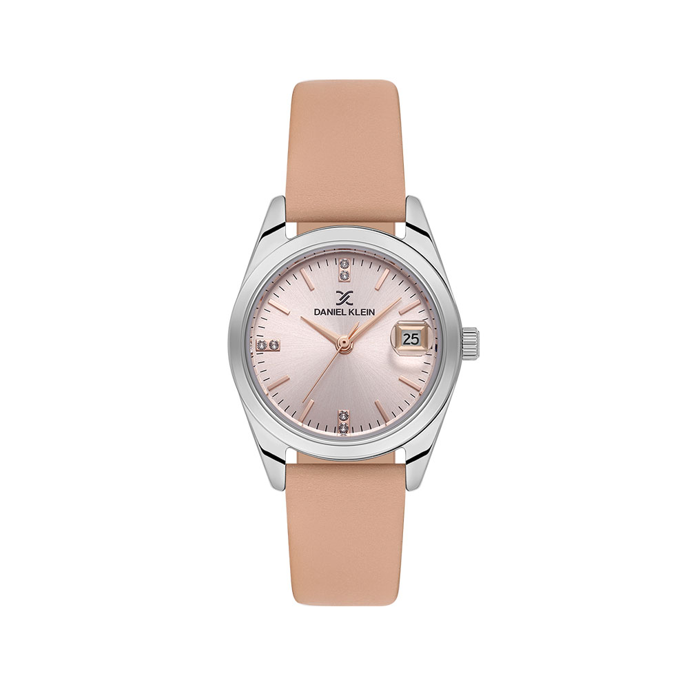 Designul fashion este subliniat de carcasa rotunda, din aliaj metalic argintiu, si de curea din piele roz, care ofera un contrast placut si un confort superior la purtare. Geamul din cristal mineral protejeaza ceasul impotriva zgarieturilor, mentinandu-l ca nou pentru o lunga perioada de timp.