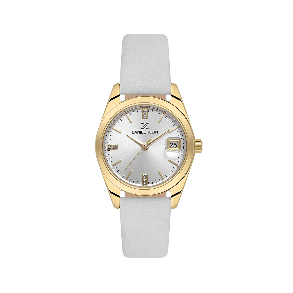 Aspectul unic este completat de afisajul analogic cu cadrane aurii si un indicator de data discret, integrat perfect in designul sofisticat al ceasului. Curea de piele alba adauga un contrast placut, iar catarama asigura o ajustare perfecta pe incheietura.
