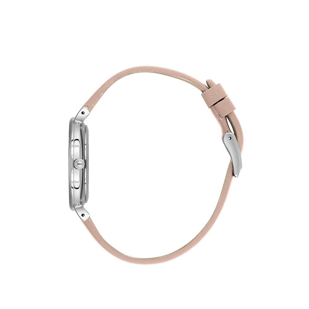 Cu un design minimalist si culoare cadran alb argintiu, ceasul se potriveste perfect cu orice tinuta, de la cele casual la cele formale. Carcasa din aliaj metalic argintiu, impreuna cu curea de piele roz, adauga o nota de eleganta si distinctie.