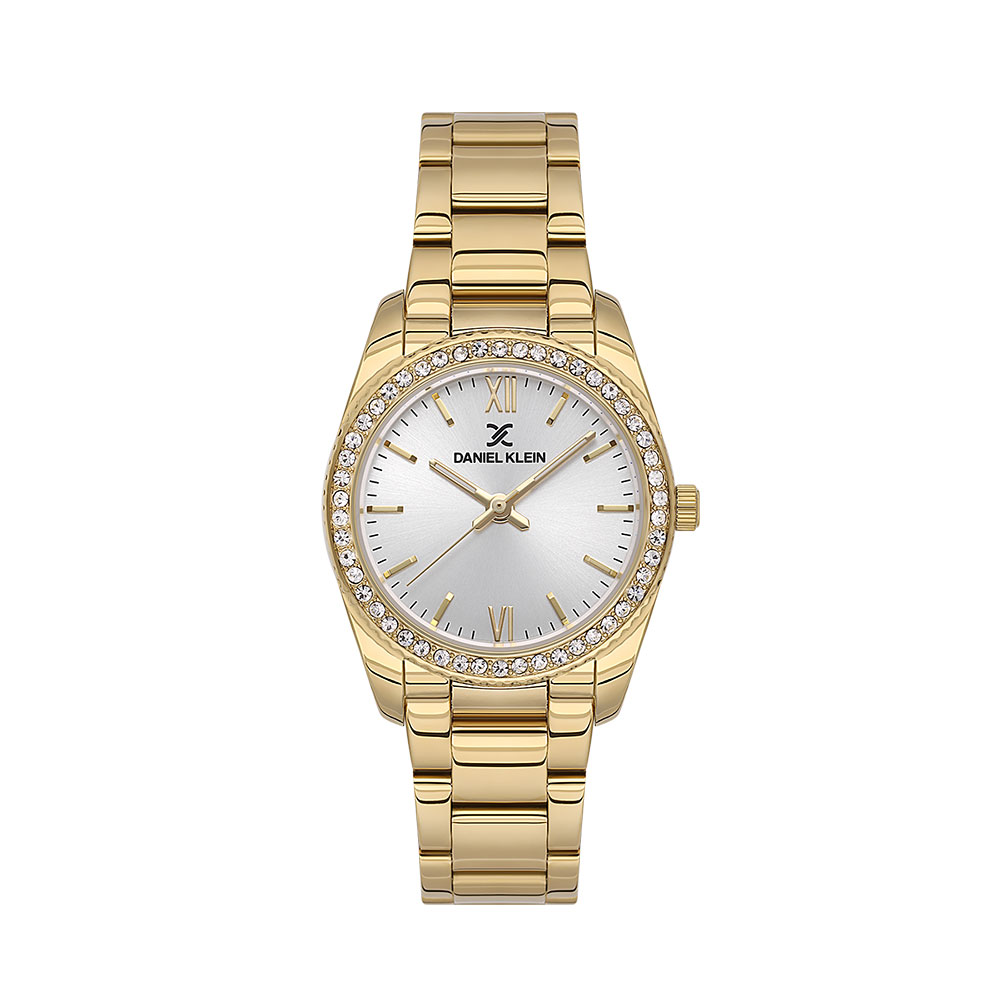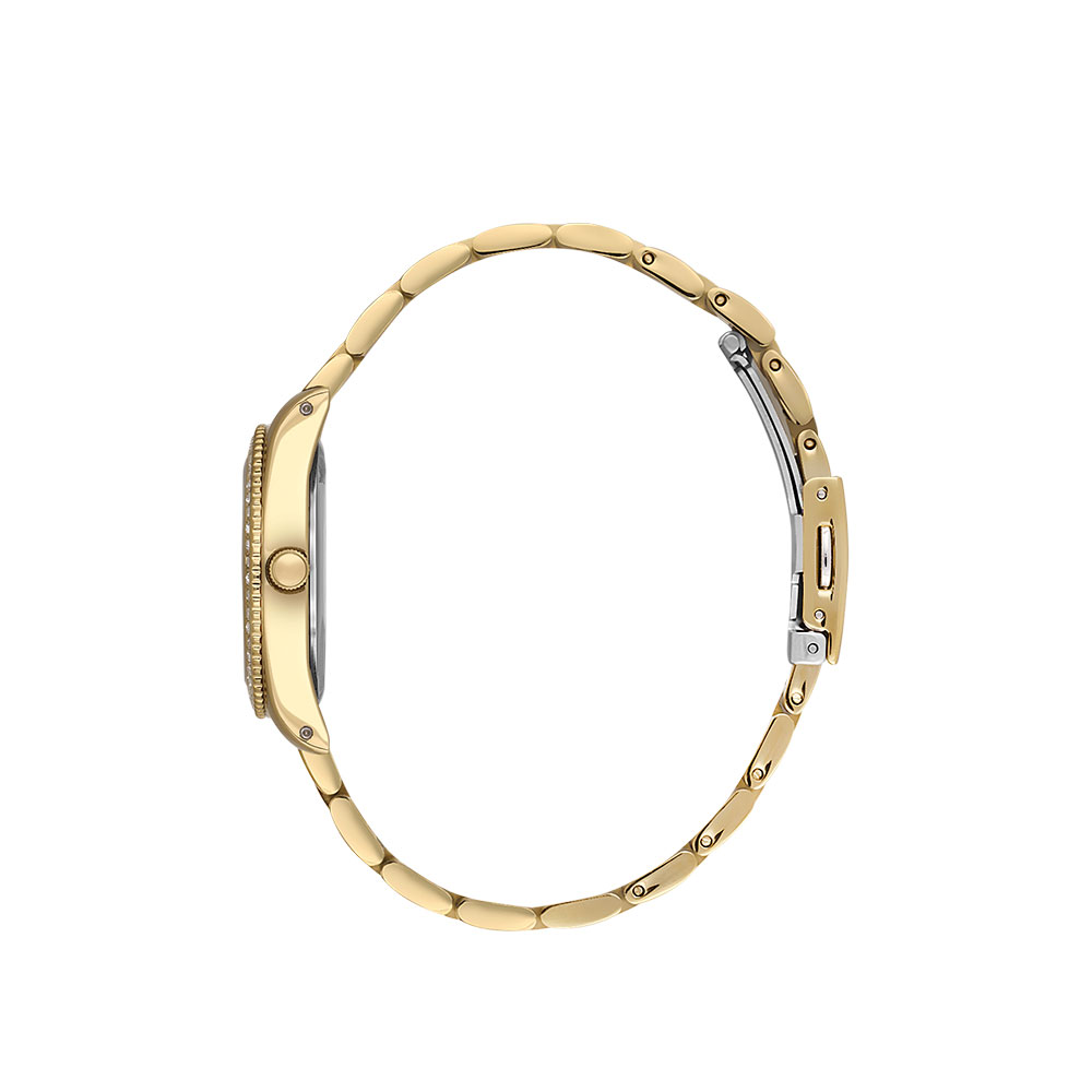 Carcasa rotunda din aliaj metalic auriu si bratara din otel inoxidabil in aceeasi nuanta transforma acest ceas intr-un veritabil accesoriu. Cu o rezistenta la apa de 3 atm, ceasul este perfect adaptat pentru a face fata provocarilor cotidiene, de la o zi aglomerata la birou, pana la un cocktail seara.
