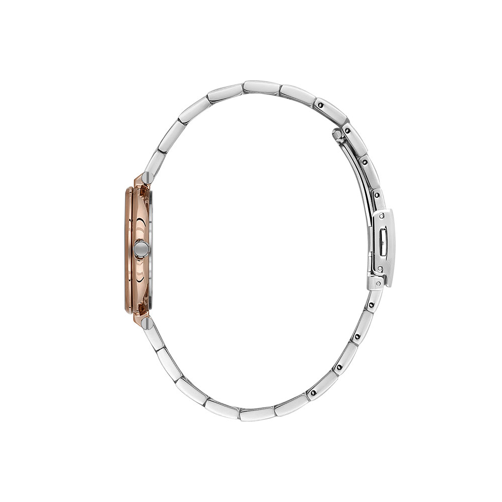 Dotat cu un mecanism quartz japonez de inalta precizie, ceasul promite o abatere minima de ±20 secunde pe luna, asigurand astfel punctualitatea dumneavoastra in fiecare zi. Cadranul argintiu, protejat de un cristal mineral durabil, este incadrat de o carcasa eleganta din aliaj metalic cu finisaj auriu rose, ce adauga un plus de eleganta oricarei tinute.