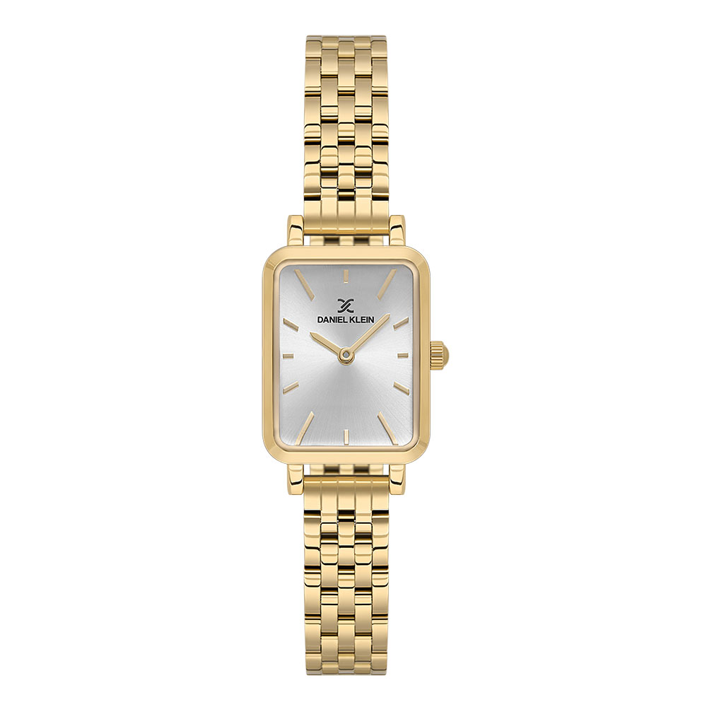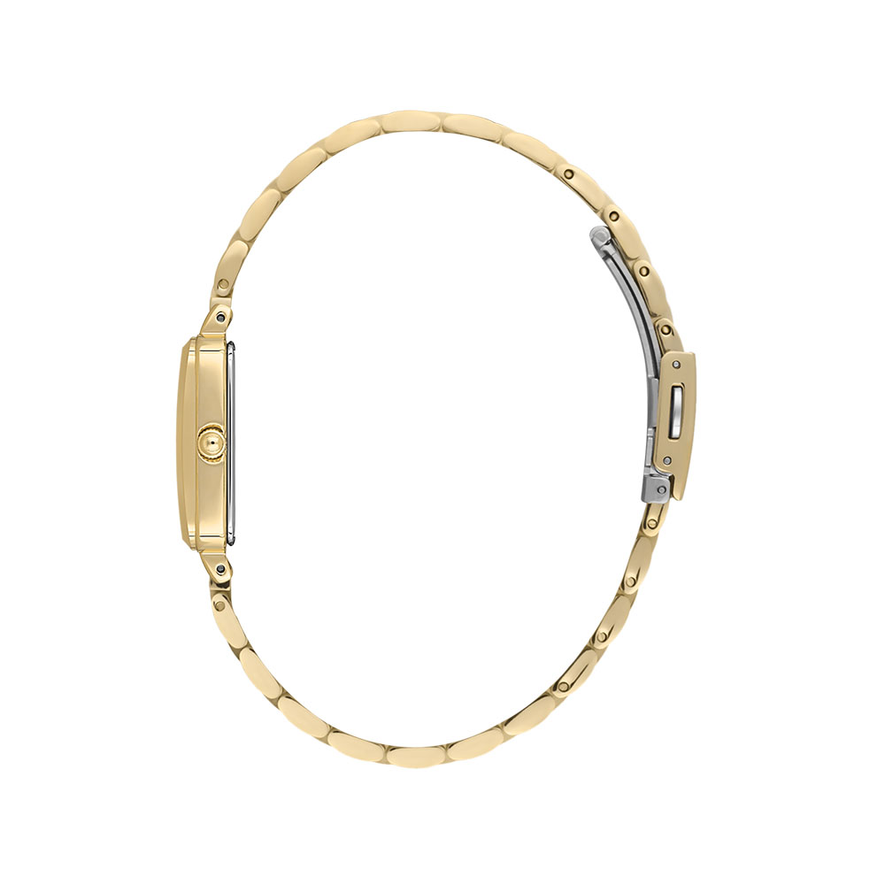 Acest model se distinge prin carcasa dreptunghiulara, de culoare aurie, realizata din aliaj metalic, complementata de o bratara din otel inoxidabil in aceeasi nuanta stralucitoare. Cadranul argintiu, protejat de un cristal mineral durabil, este punctat de indicatoare discrete care iti permit sa citesti ora cu usurinta, in timp ce mecanismul quartz japonez asigura o precizie remarcabila.