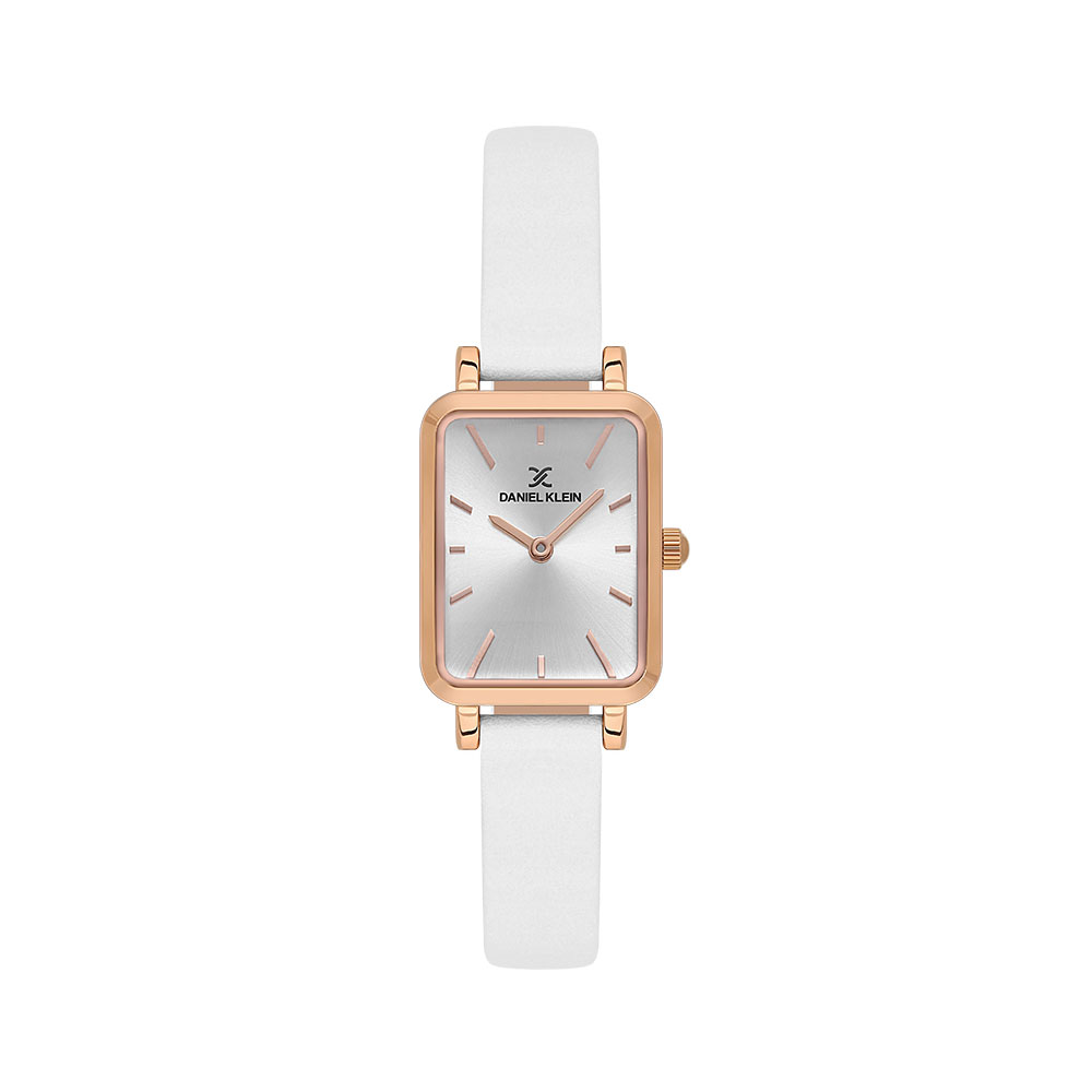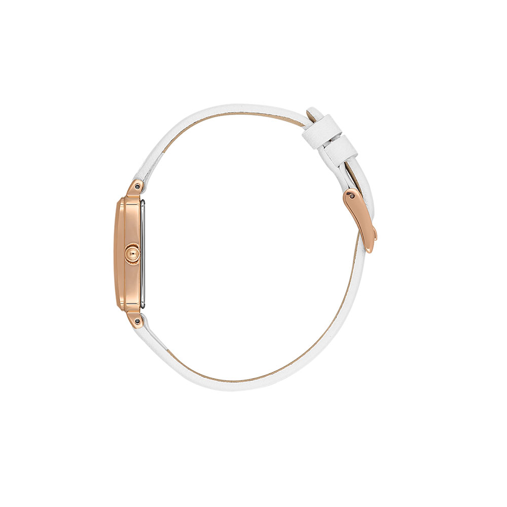 Dotat cu un mecanism Quartz de provenienta japoneza, ceasul promite o abatere minima de ± 20 secunde pe luna, asigurand precizie si durabilitate. Afisajul analogic, protejat de un cristal mineral rezistent, este incadrat elegant de o carcasa dreptunghiulara din aliaj metalic cu finisaj in culoarea auriu rose, care ofera un contrast placut cu banda alba din piele veritabila.