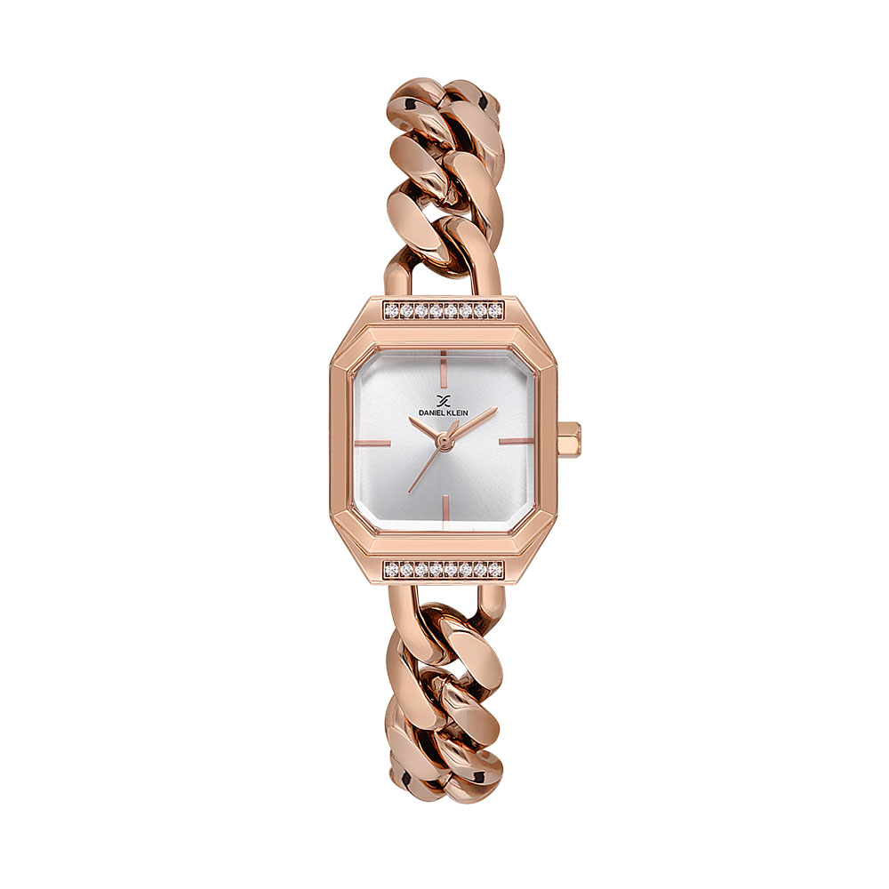 Avand un mecanism quartz japonez cu o abatere minima de ±20 secunde pe luna, acest ceas promite acuratete si durabilitate. Cadranul argintiu, protejat de un cristal mineral rezistent, este incadrat de o carcasa dreptunghiulara din aliaj metalic cu finisaj in culoarea auriu rose, oferind un contrast sofisticat si atragator.