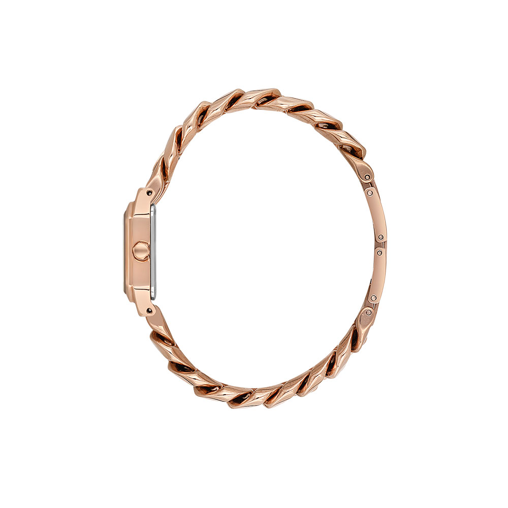 Bratara din otel inoxidabil in culoarea auriu rose, cu sistem de inchidere tip bijuterie, adauga o nota de eleganta si confort. Rezistenta la apa de 3 atm face ceasul potrivit pentru uz cotidian, protejandu-l in fata stropilor accidentali de apa.