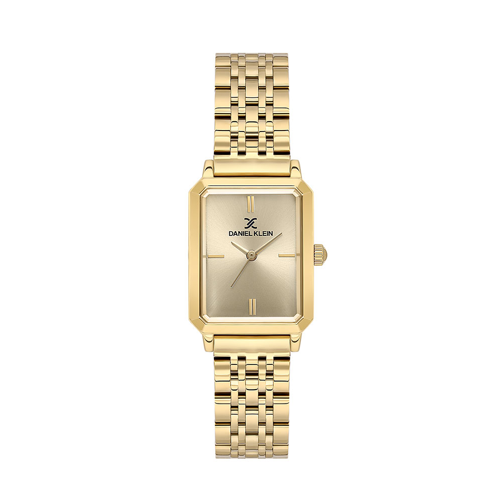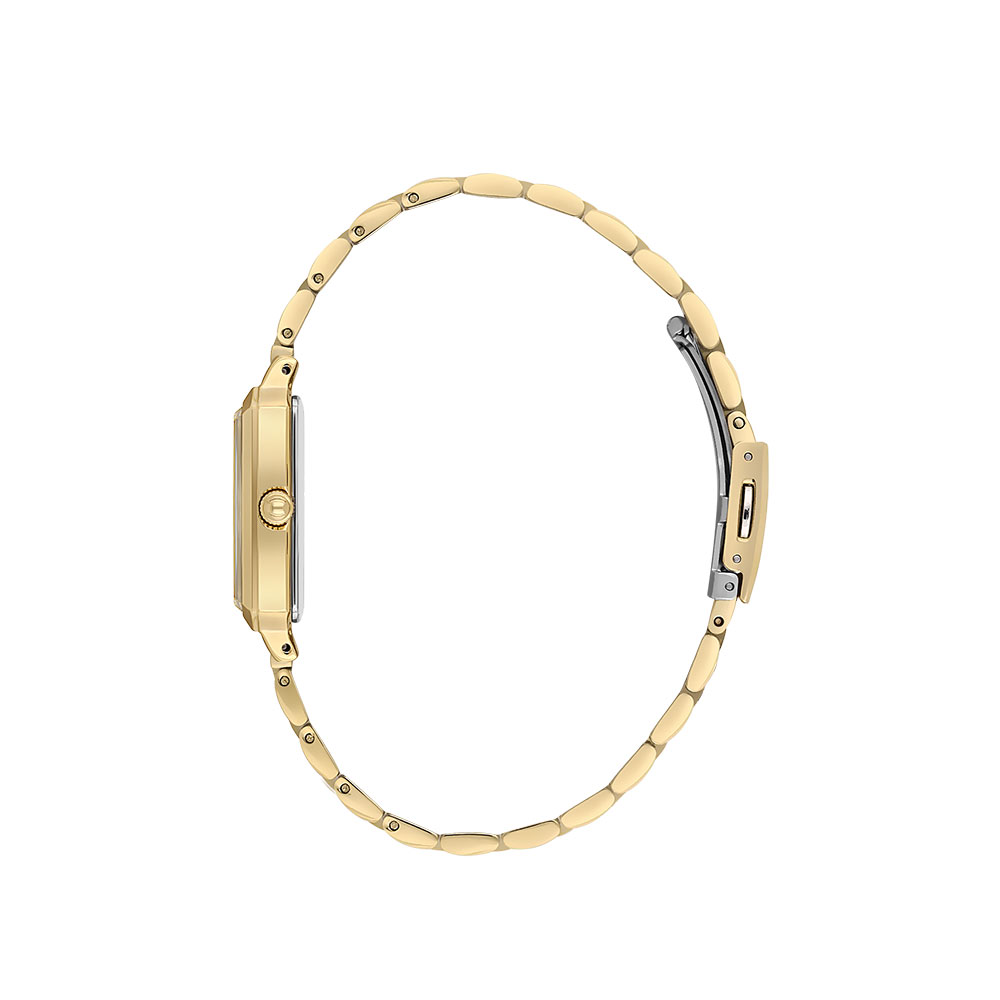 Dotat cu un mecanism Quartz de provenienta japoneza, acest ceas garanteaza o abatere minima de timp, de doar ± 20 secunde pe luna, asigurand fiabilitate si acuratete. Cadranul analogic auriu, protejat de un cristal mineral durabil, este complementat perfect de carcasa dreptunghiulara si bratara din otel inoxidabil, ambele finisate in nuante de aur.