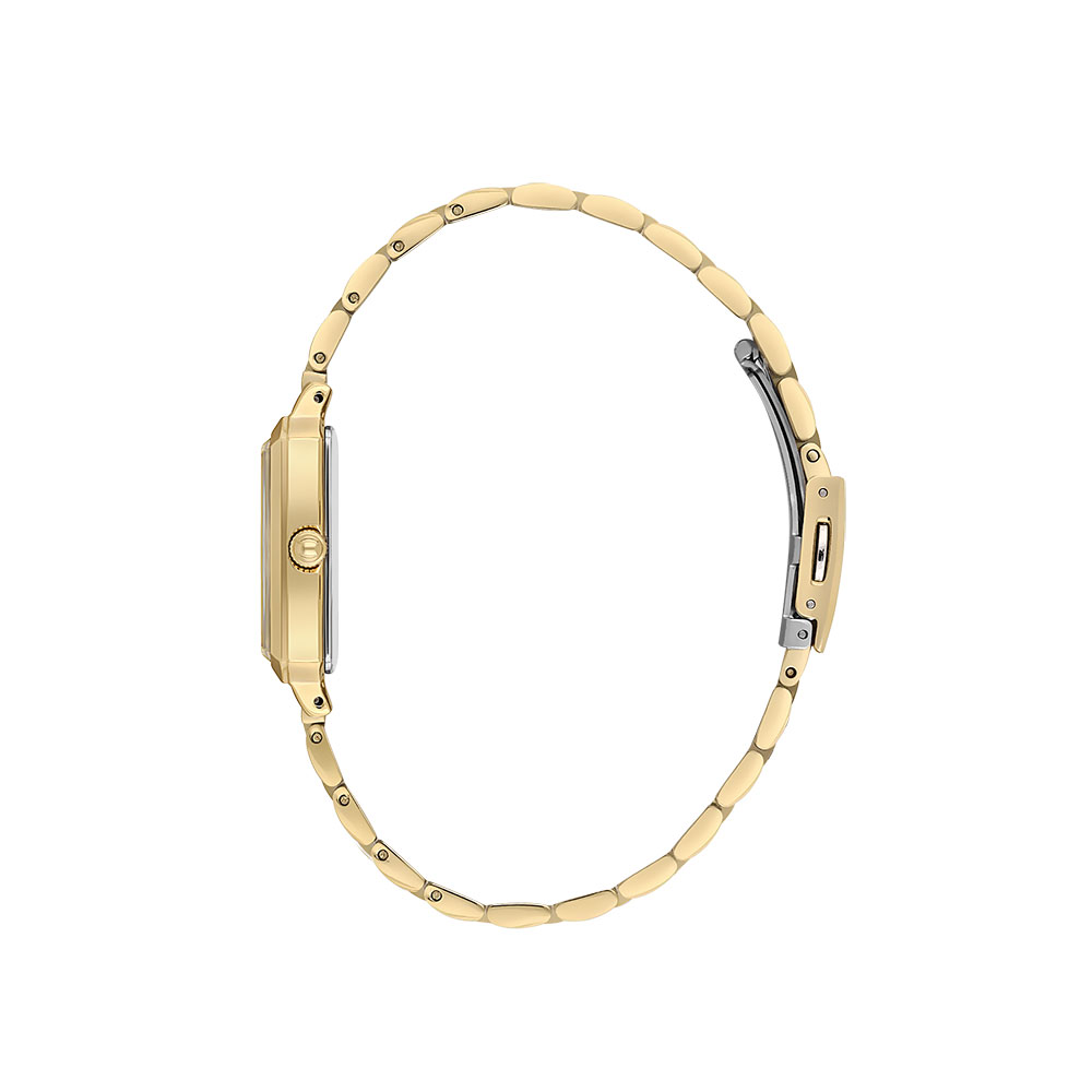 Fiecare detaliu al acestui ceas a fost finisat cu maxima atentie. Carcasa dreptunghiulara din aliaj metalic auriu, impreuna cu bratara din otel inoxidabil in aceeasi nuanta pretioasa, confera un aspect luxos si durabil. Geamul din cristal mineral protejeaza cadranul elegant, asigurand rezistenta la zgarieturi si uzura zilnica, iar mecanismul japonez Quartz garanteaza o precizie deosebita.