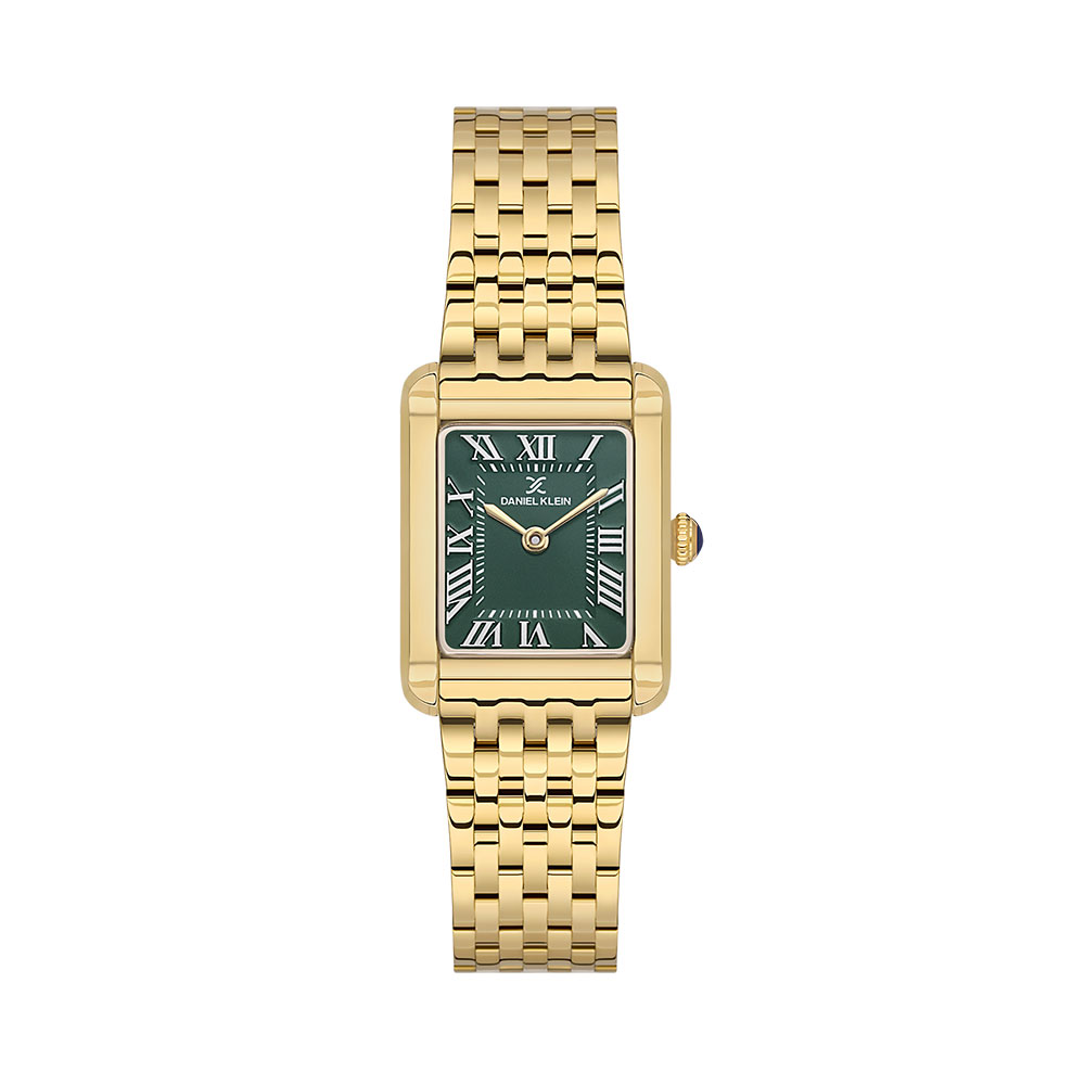 Cadranul de culoare verde este protejat de un geam din cristal mineral rezistent la zgarieturi, iar carcasa dreptunghiulara din aliaj metalic auriu confera un aspect luxos. Ceasul este echipat cu un mecanism quartz de provenienta japoneza, recunoscut pentru precizia sa, avand o abatere de ±20 secunde pe luna.