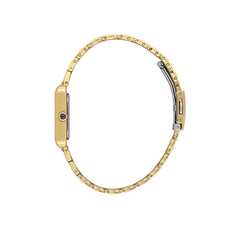 Bratara eleganta din otel inoxidabil in nuanta aurie se inchide printr-un sistem de tip fluture, usor de manevrat si sigur. Rezistenta la apa de 3 atm face acest ceas potrivit pentru uz cotidian, protejandu-l impotriva stropilor de apa.
