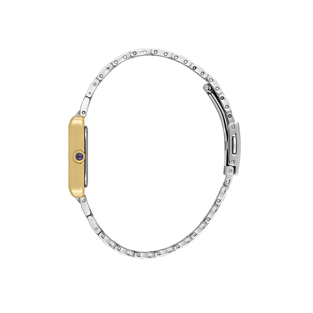 Caracterizat printr-un design dreptunghiular unic, cu o carcasa aurie de 30 mm lungime si 23 mm latime, acest ceas se distinge prin eleganta sa subtila. Geamul din cristal mineral, rezistent la zgarieturi, protejeaza un cadran alb argintiu, decorat cu cifre romane ce reflecta un aer clasic.