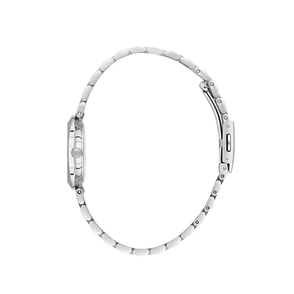Dotat cu un mecanism quartz de provenienta japoneza, acest ceas garanteaza o abatere minima de timp (± 20 secunde pe luna), asigurand acuratete si fiabilitate. Afisajul analogic, impreuna cu cristalul mineral rezistent la zgarieturi, accentueaza estetica rafinata a ceasului. Cadranul argintiu, decorat cu indici discreți, complementează perfect bratara din otel inoxidabil, oferind un aspect coerent si atragator.