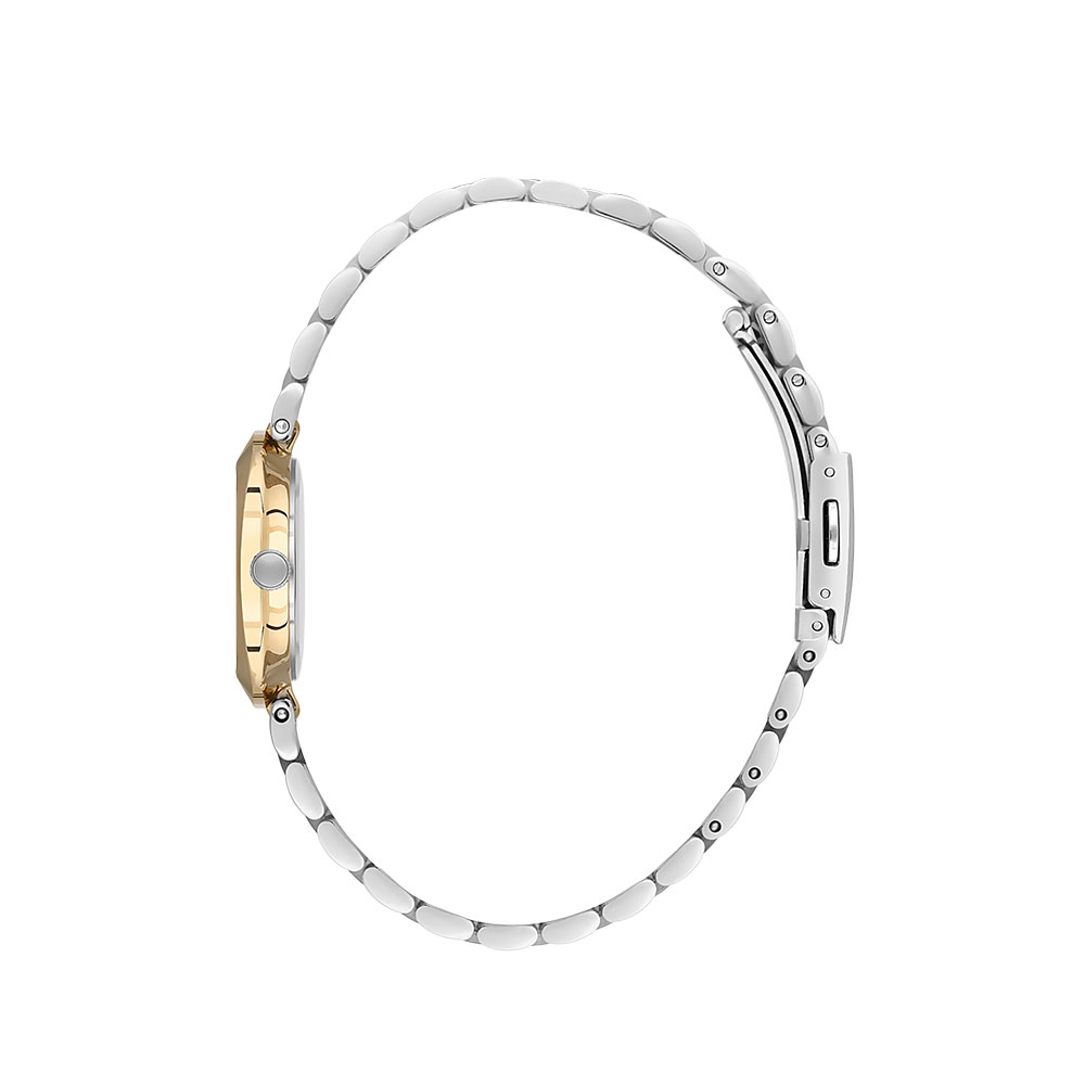 Curea de otel inoxidabil in culori argintiu si auriu este dotata cu un sistem de inchidere tip fluture, care nu numai ca arata spectaculos, dar este si extrem de practic. Rezistenta la apa de pana la 3 atm face acest ceas potrivit pentru uz zilnic, rezistand la ploaie si stropi accidentali.
