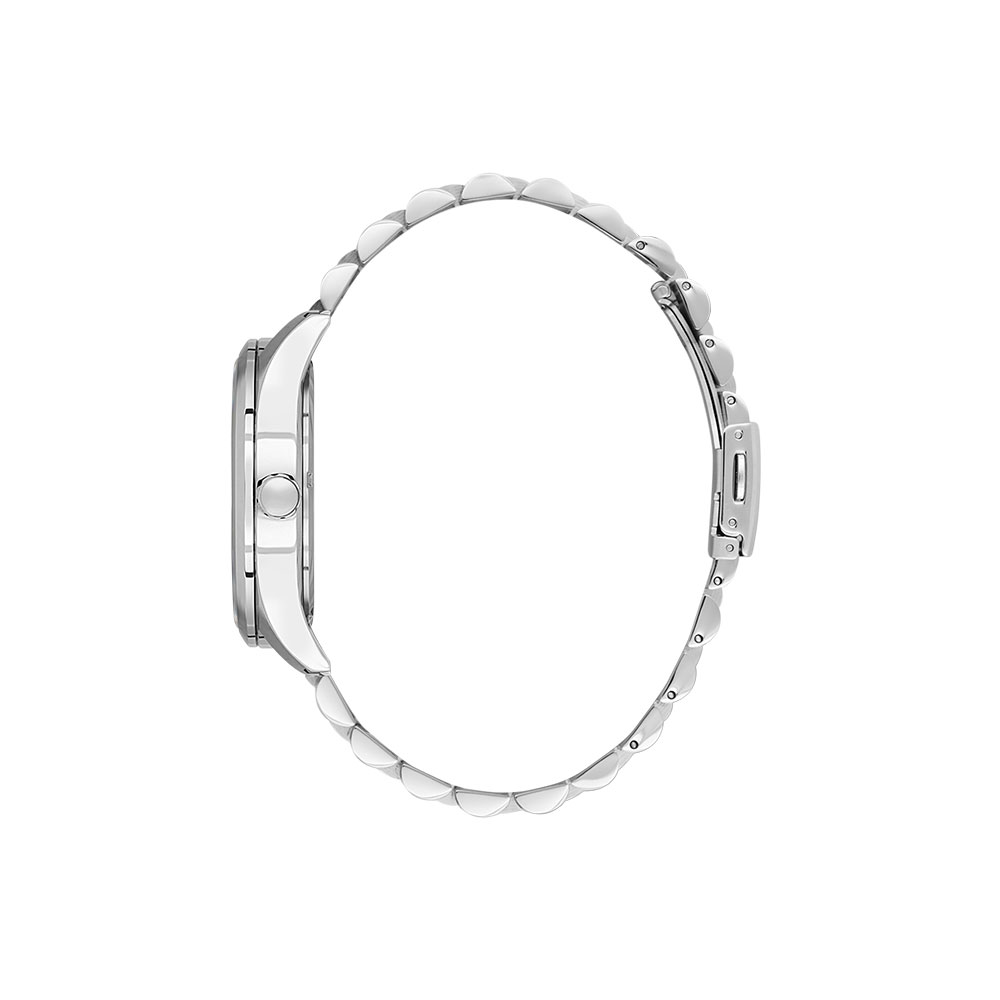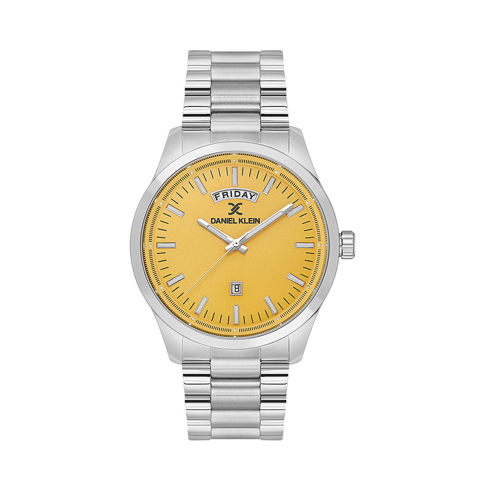 Cu un design sofisticat, ceasul prezinta un cadran galben vibrant, protejat de un geam din cristal mineral, oferind un contrast elegant cu carcasa argintie din aliaj metalic. Dimensiunile carcasei de 43 mm lungime si 11 mm grosime sunt perfect proportionate pentru un look modern si rafinat.