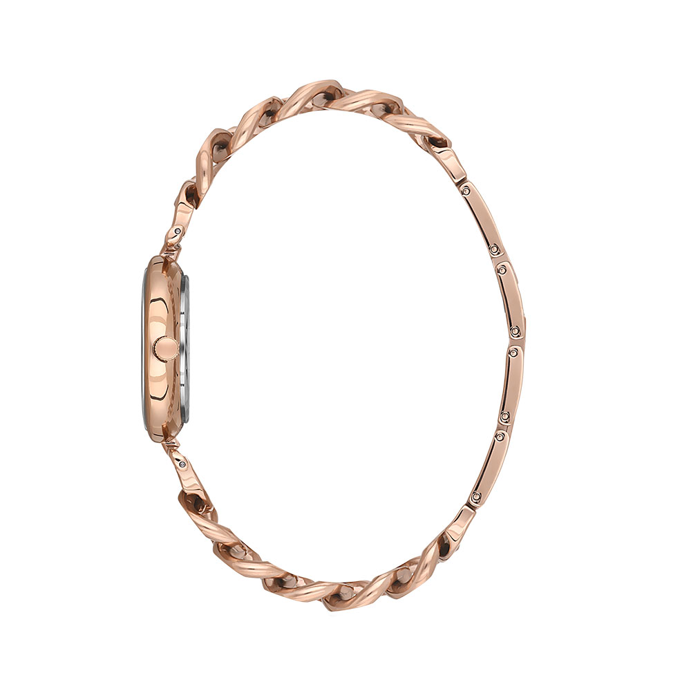 Carcasa rotunda din alama, impreuna cu geamul din cristal mineral, garanteaza durabilitate si claritate, in timp ce bratara din otel inoxidabil in culoarea auriu rose adauga un touch de rafinament. Rezistenta la apa de pana la 3 atm asigura protectie si in conditii de umiditate, facand ceasul potrivit pentru uz zilnic, dar si pentru ocazii speciale.