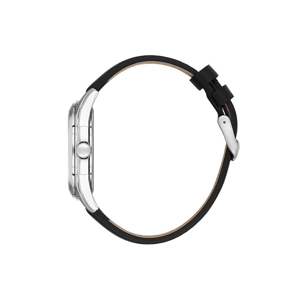 Curea de piele neagra, ajustabila, ofera confort si durabilitate, in timp ce rezistenta la apa de 5 atm il face potrivit pentru uz zilnic, chiar si in conditii umede. Afisajul analogic imbogatit cu o fereastra de data iti permite sa ramai la curent cu fiecare zi care trece.